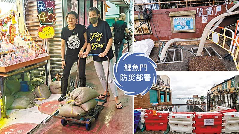昨日傍晚,香港文匯報記者到風暴水浸黑點之一的鯉魚門村,看到渠務署已安裝排水泵及水管,在海邊擺放水馬作臨時擋水用途,以及放置沙包供商戶及居民使用。一間食肆的負責人李小姐表示,今次「樺加沙」襲港,政府已預告風力強勁且有大量雨水及天文大潮,因此會預早一日做定預防措施,盡量把食材等貨物抬入舖內及升高,因此未必會在今日繼續營業。