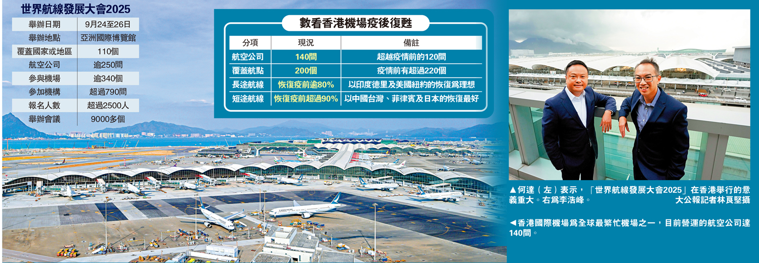 「世界航線發展大會2025」由香港國際機場與全球航空業界活動主辦機構Routes合辦,吸引來自110個國家或地區、超過790間機構來港參加會議,是歷來最多。何達指出,現時有超過2500人報名、超過340個機場及逾250間航空公司參加,其間更會舉辦9000多場會議,讓全球航空業界聚首一堂,就多個與航空業發展相關的議題交流意見及討論,並探討在港機遇及開通新航線的可能性。