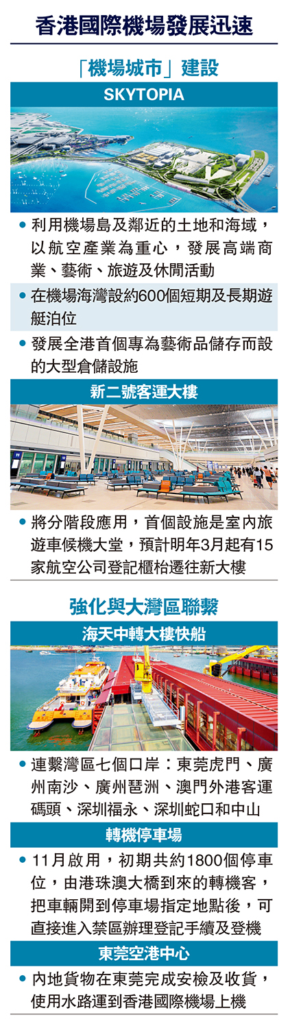此外,香港國際機場作為大灣區的核心機場,擁有「引進來、走出去」角色優勢。何達表示,未來會進一步增加香港機場的連接性,讓無論是香港還是國內外旅客均能有更多選擇,並透過多式聯運強化與大灣區內地城市的接駁,同時在餐飲、購物和服務等方面提升客戶體驗,使香港機場繼續成為大家的首選樞紐機場。