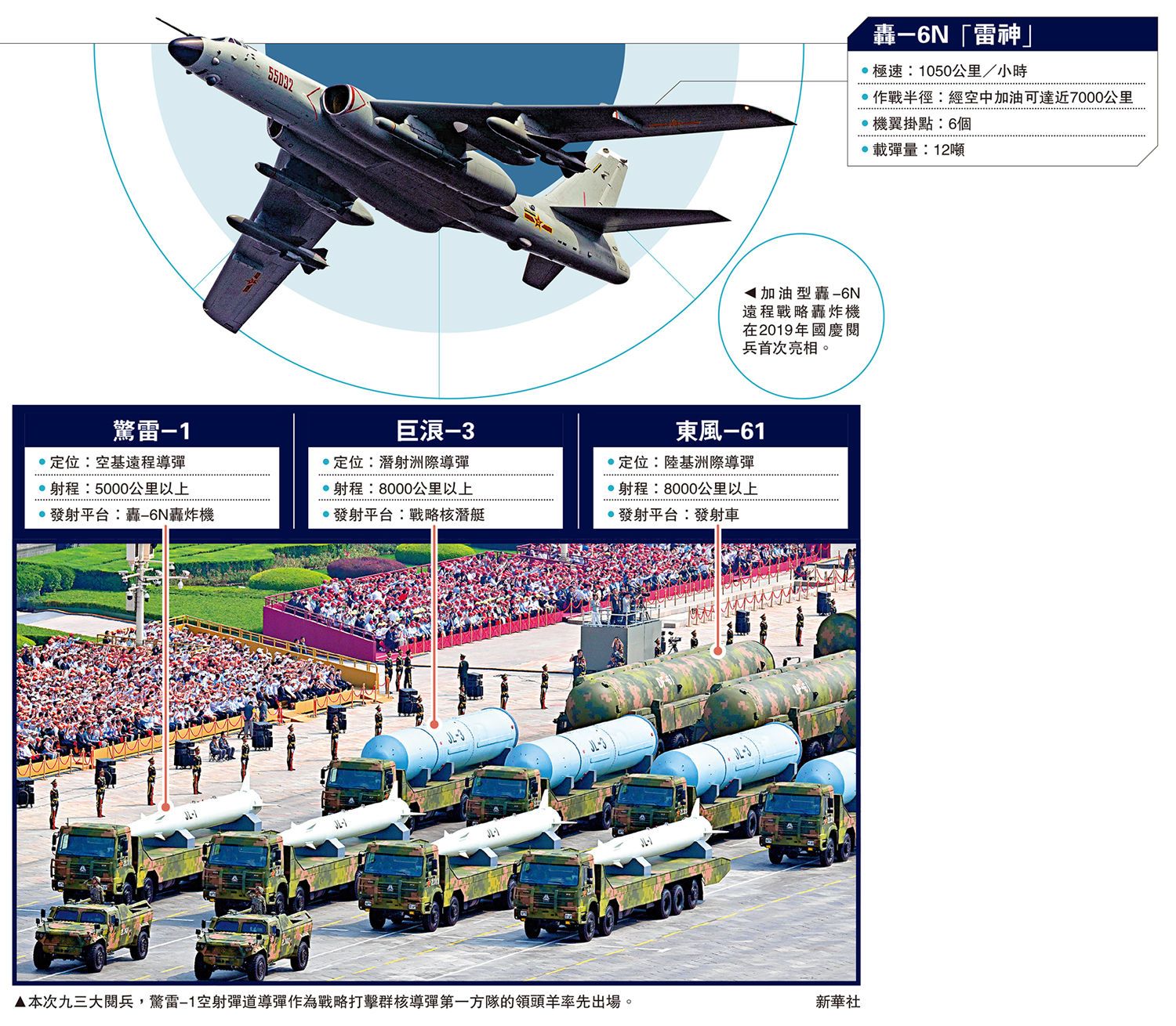 在早前的九三大閱兵之中,驚雷-1空射彈道導彈首次亮相,這是中國第一款空基核彈,與陸基的「東風」、海基潛射的「巨浪」,共同構成了中國三位一體的核威懾核打擊體系。