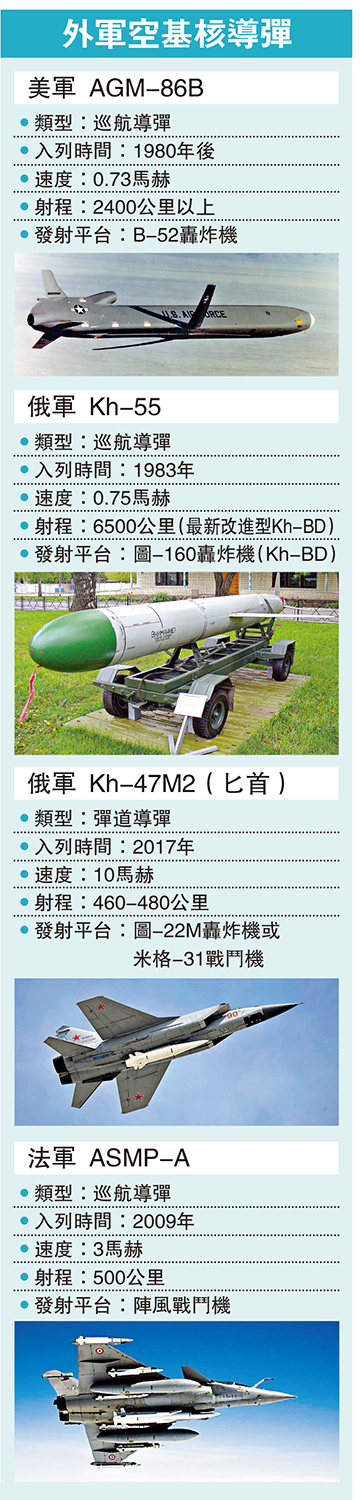 更為重要的是,此前其他國家的空基核力量,多數是以巡航導彈搭載核彈頭,比如美軍的AGM-86B、俄軍的Kh-55、法軍的ASMP-A。而驚雷-1則是一款彈道導彈,其射程、速度、載彈量,都遠非巡航導彈可比。因此,雖然轟-6N作為發射平台,其航程較之美軍、俄軍的大型戰略轟炸機稍遜一籌,但驚雷-1的射程彌補了這一點。
