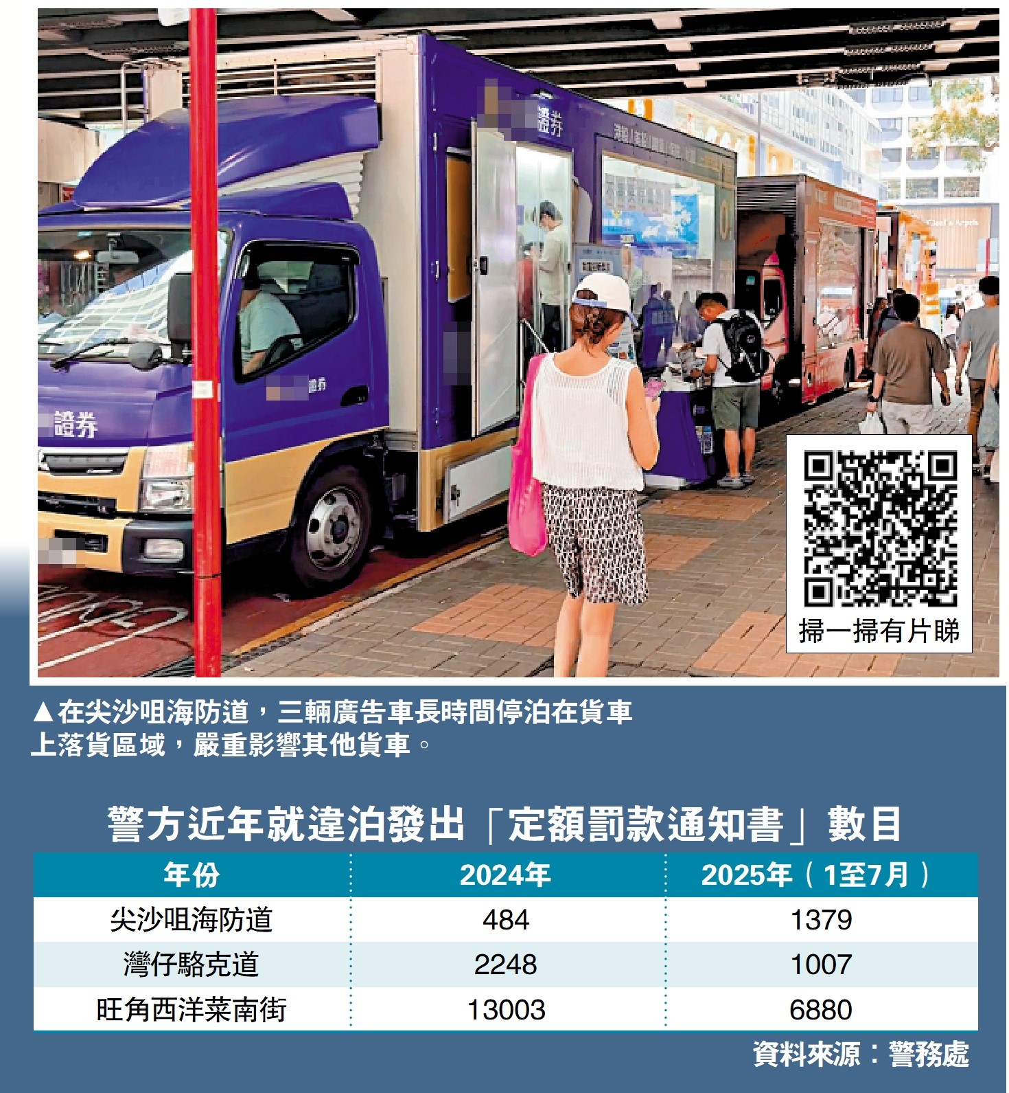 除尖沙咀、銅鑼灣外,灣仔、荃灣、深水埗、旺角等旺區亦存在類似問題。日前記者在旺角西洋菜南街發現,一輛廣告車長時間違規停靠在僅允許臨時上落客、上落貨的車位,該區域路牌明確標示「停車等候即檢控,不予警告」,但該車直至傍晚8時許仍未離開,其間未受到任何執法干預。
