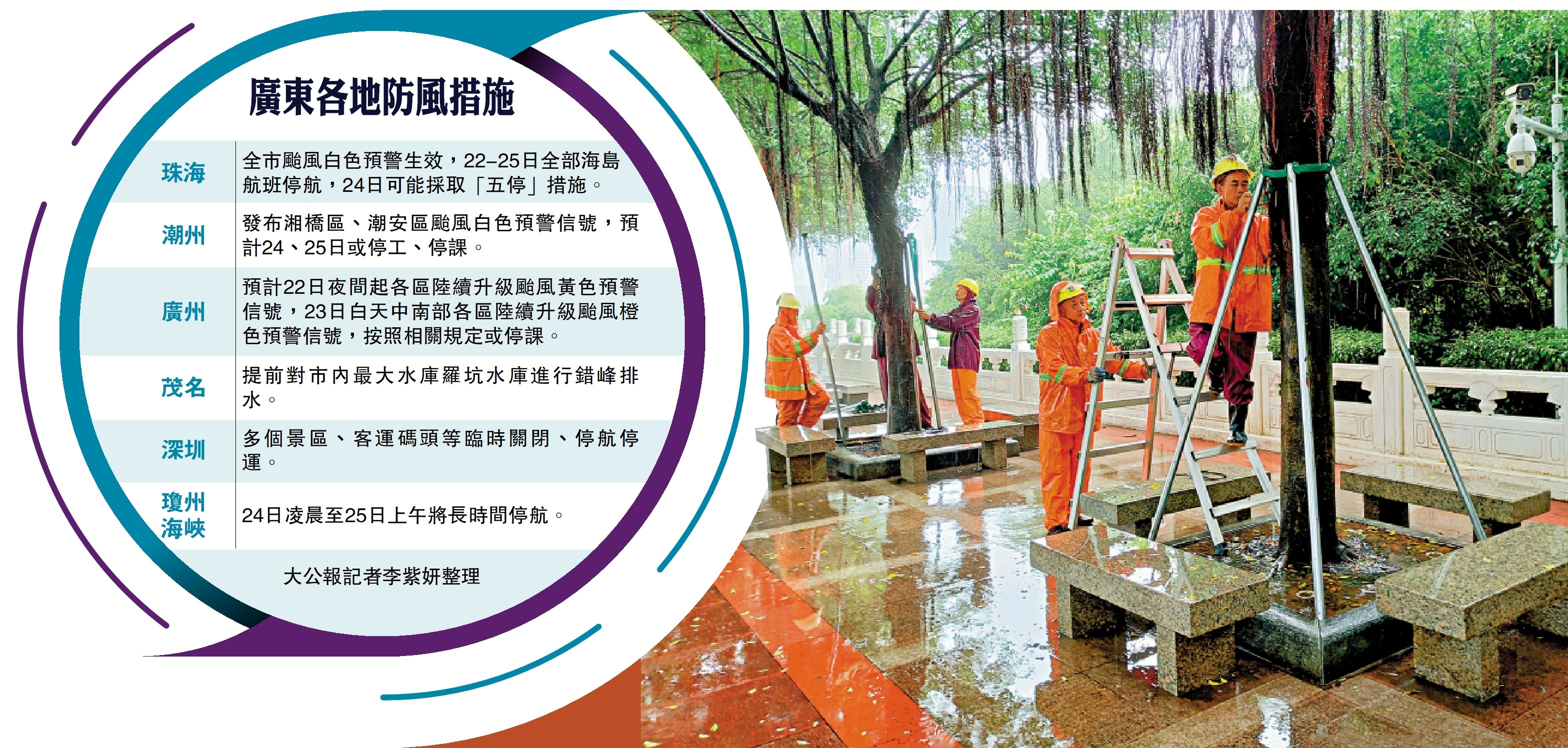 據珠海市氣象台消息,珠海颱風預警信號不排除升級至紅色(內地最高級別颱風預警)的可能性。珠海市三防指揮部提醒,珠海周三(24日)可能受影響採取「五停」防颱措施(即:停課、停工、停產、停運、停業),並提醒市民做好防風防水浸準備,儲備應急物品、加固門窗和懸掛物,各企業做好停工準備,地下空間的商舖、居住人員提前撤離到安全區域,做好各項颱風防禦準備。22日至25日,珠海全部海島航班停航。