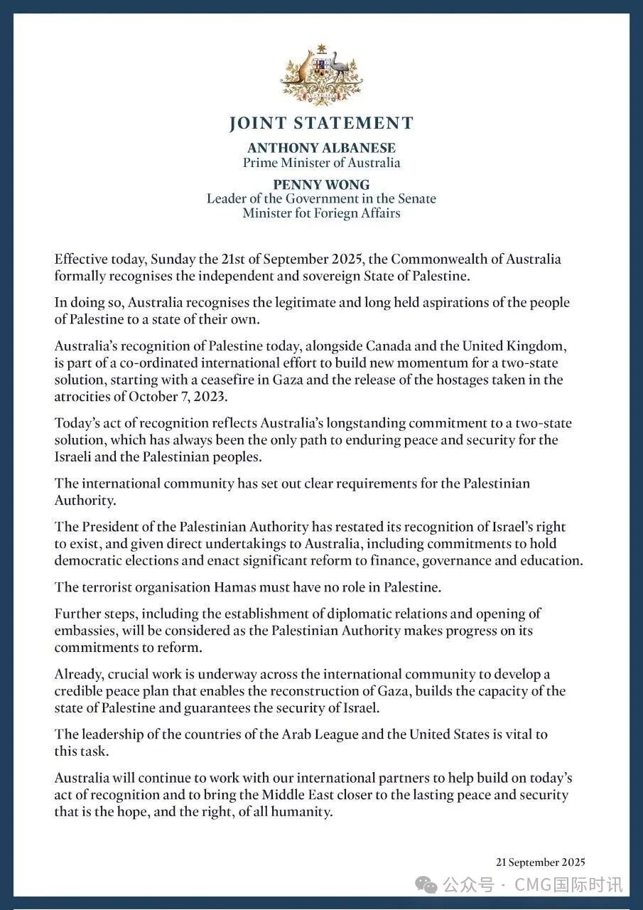 澳大利亞政府21日發表新聞公報,宣布從即日起承認巴勒斯坦國。公報說,澳大利亞與加拿大、英國一道承認巴勒斯坦國,旨在為「兩國方案」注入新的動力。隨着巴勒斯坦民族權力機構履行改革承諾,澳方「將考慮採取進一步措施,包括建立外交關係和開設使館」。