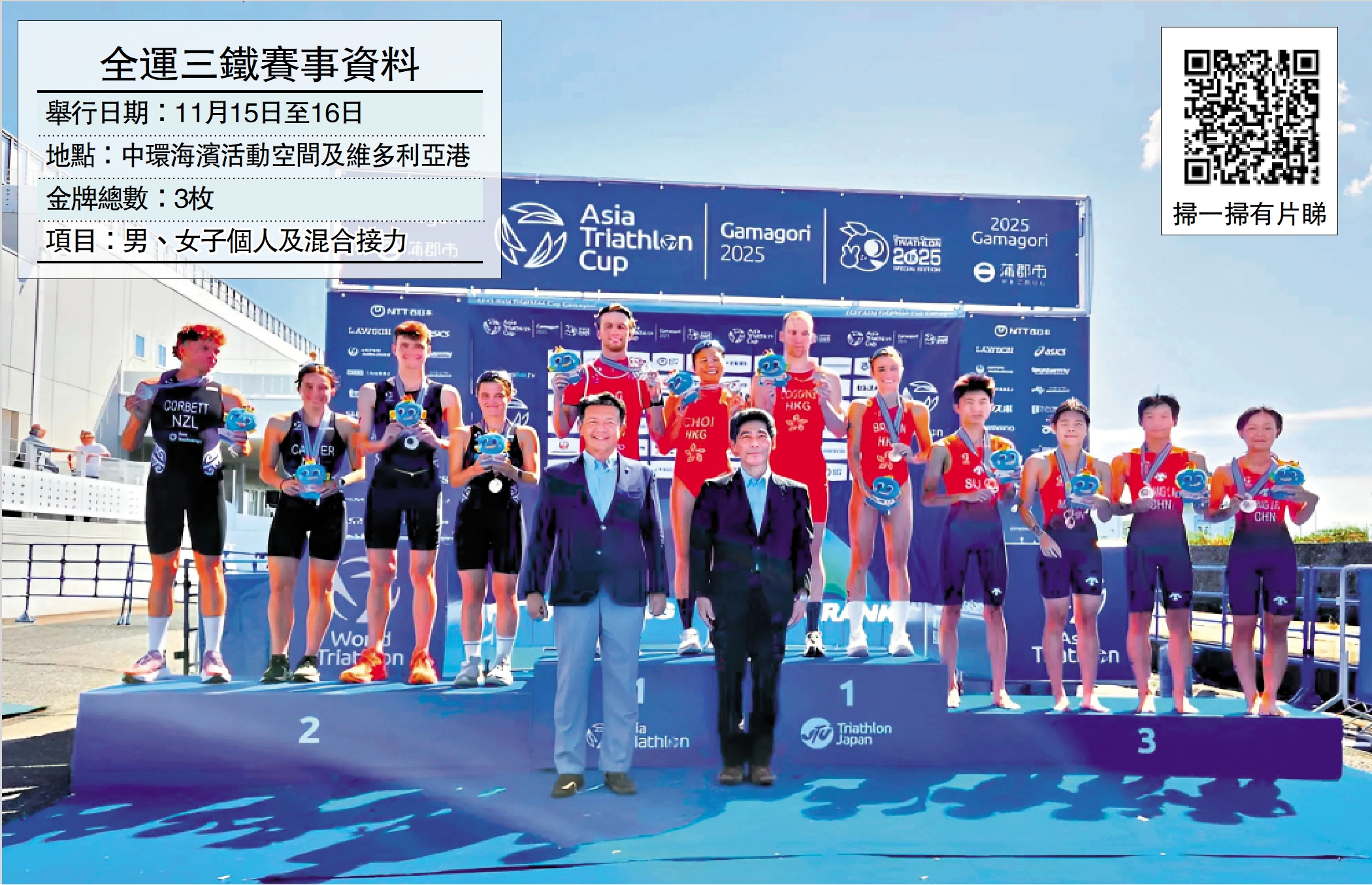 (大公報 記者 張銳)由彭詩雅、奧斯卡、蔡欣妍及Robin Elg組成的中國香港三項鐵人代表隊,9月21日在日本蒲郡市舉行的三項鐵人亞洲盃混合接力賽以1小時27分17秒的總成績奪冠,新西蘭隊及國家隊則分列亞、季軍。這次冠軍對正在備戰提升狀態迎接11月全運會的港隊而言,是一大鼓舞。