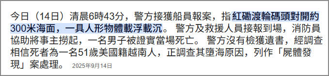 9月14日,紅磡輪渡碼頭海面驚現浮屍。