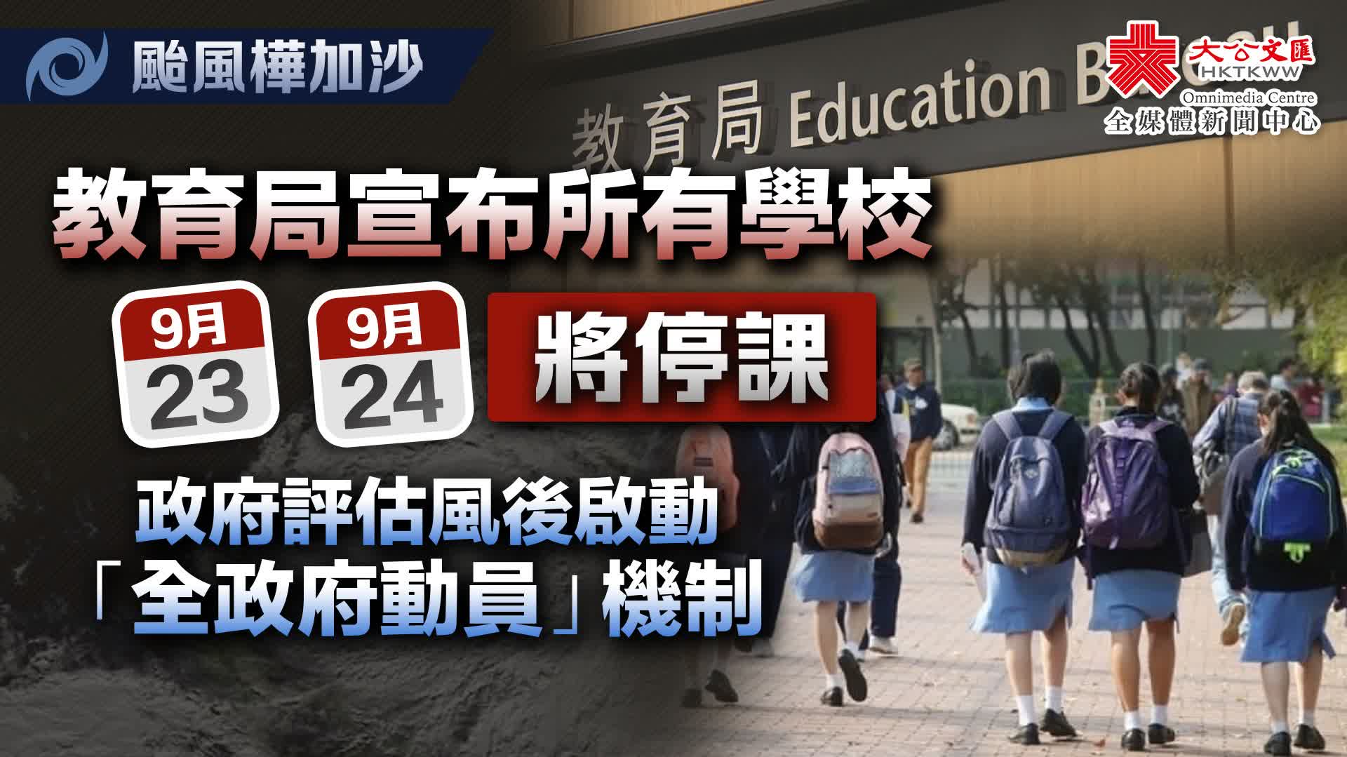 考慮到天文台預測,為確保學生安全,避免學生於天氣可能急速轉壞的情況下離開學校,教育局宣布所有學校(包括中學、小學、特殊學校、幼稚園、幼稚園暨幼兒中心及夜校)明日及後日(23日及24日)將停課。停課期間,學校暫停接收2026年度小一入學自行分配學位的紙本申請。有關紙本申請的截止日期延至9月30日(星期二)。家長亦可選擇於9月26日(星期五)或之前透過「小一入學電子平台」遞交電子申請。
