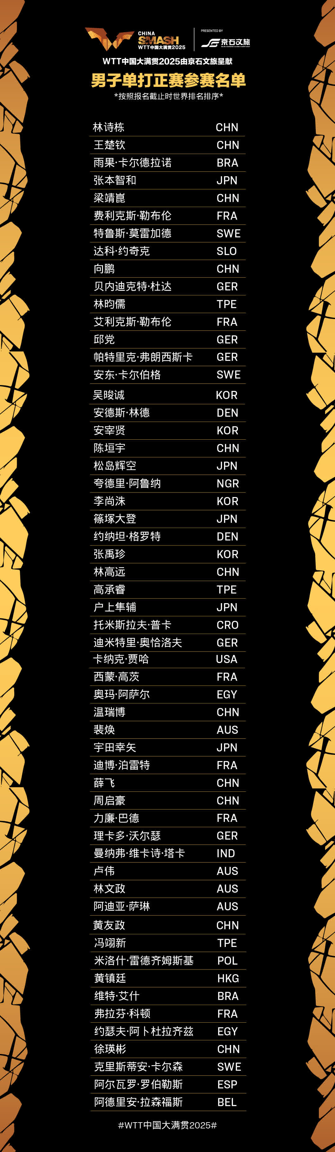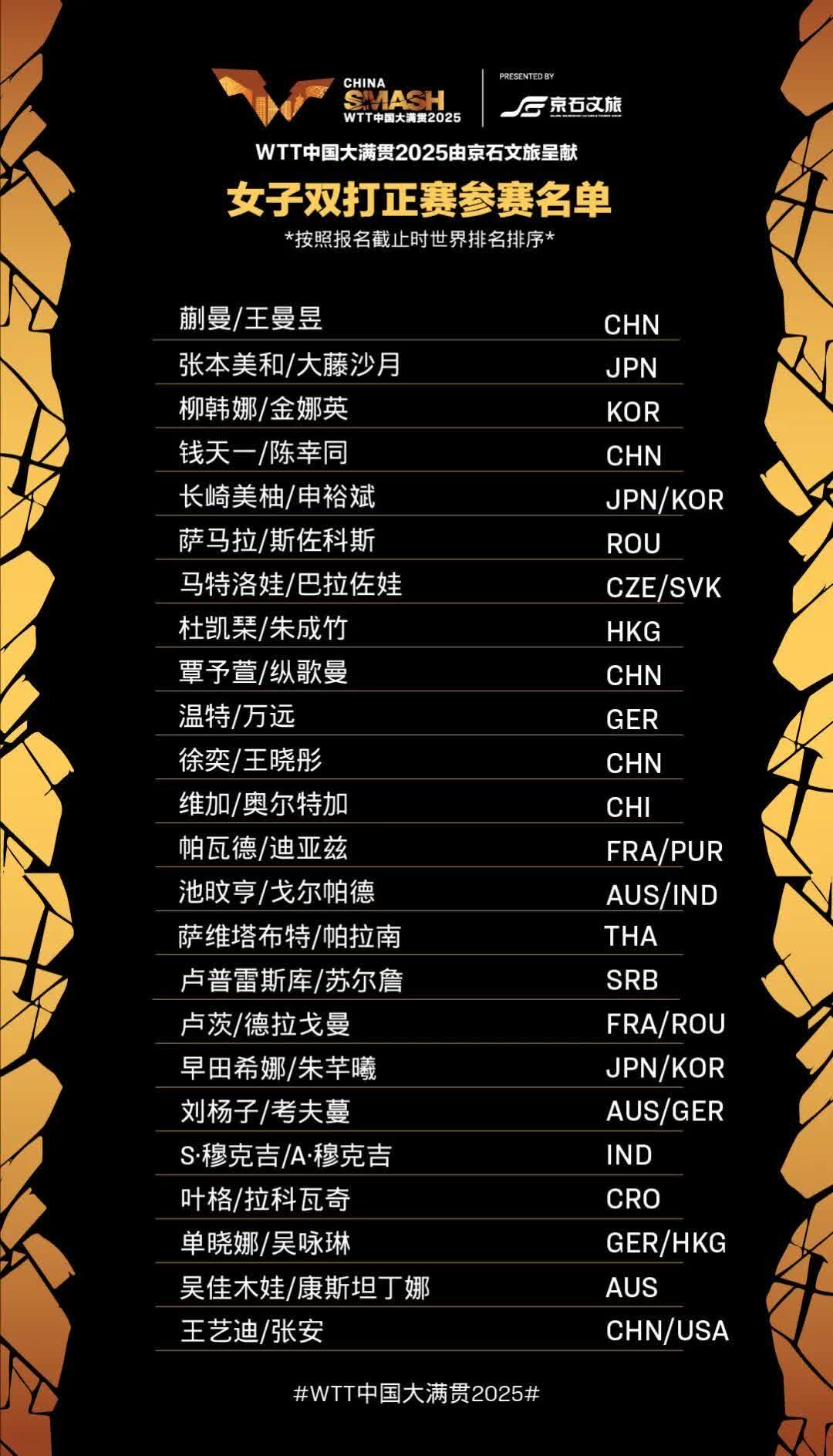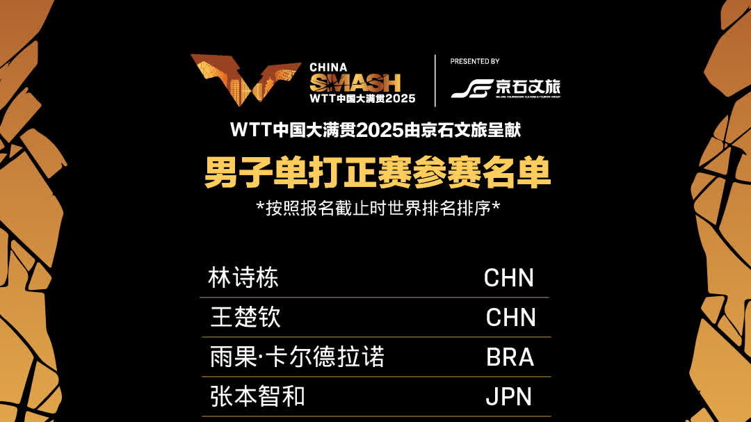 大公文匯網報道,WTT中國大滿貫2025正賽將於9月28日打響,參賽陣容已公布,正賽抽籤儀式將於9月26日下午舉行。男、女單打正賽還有8個席位將通過9月25日至27日進行的資格賽決出。