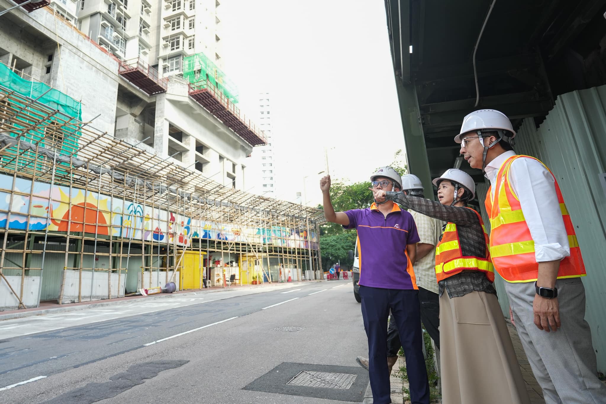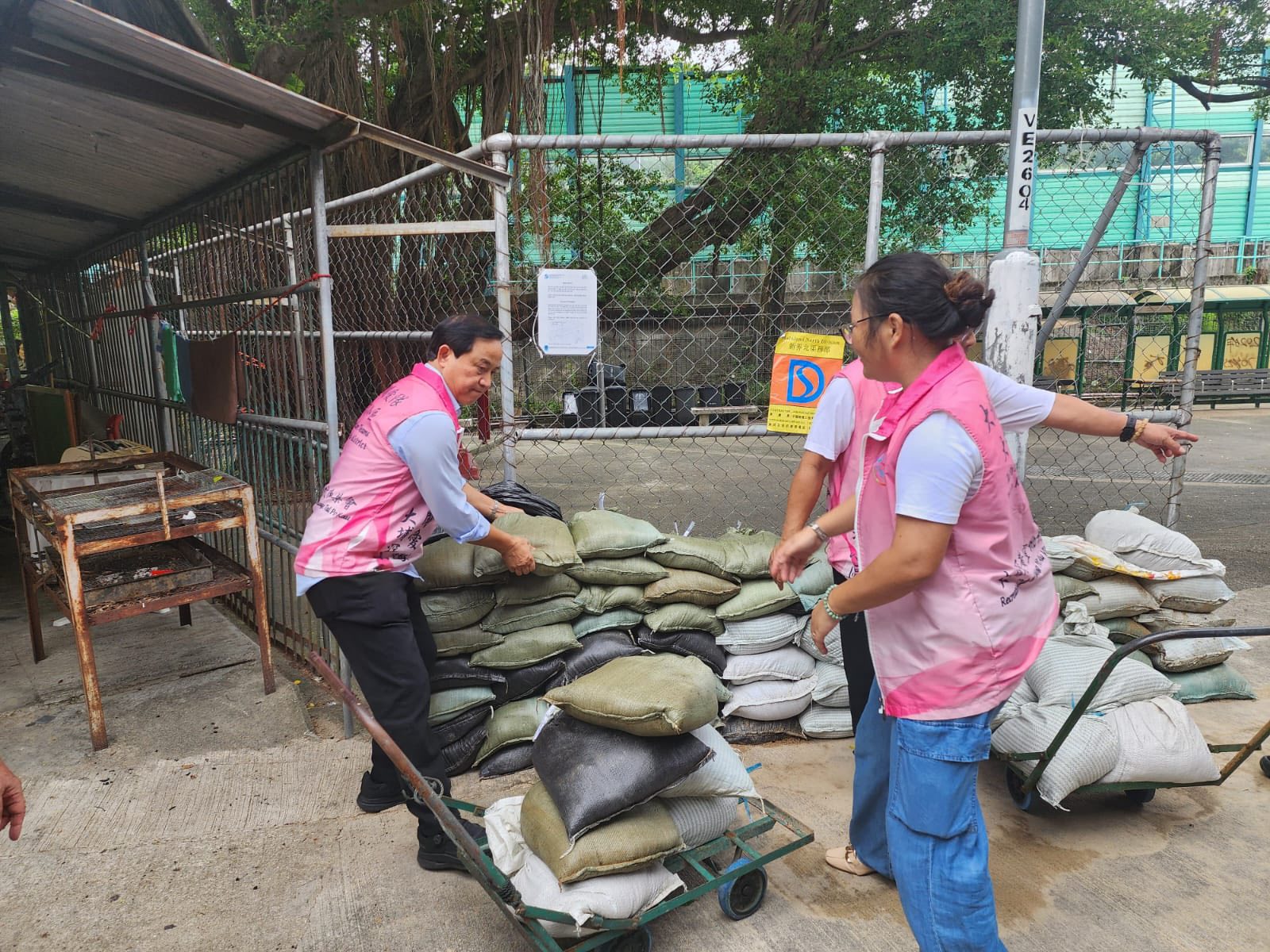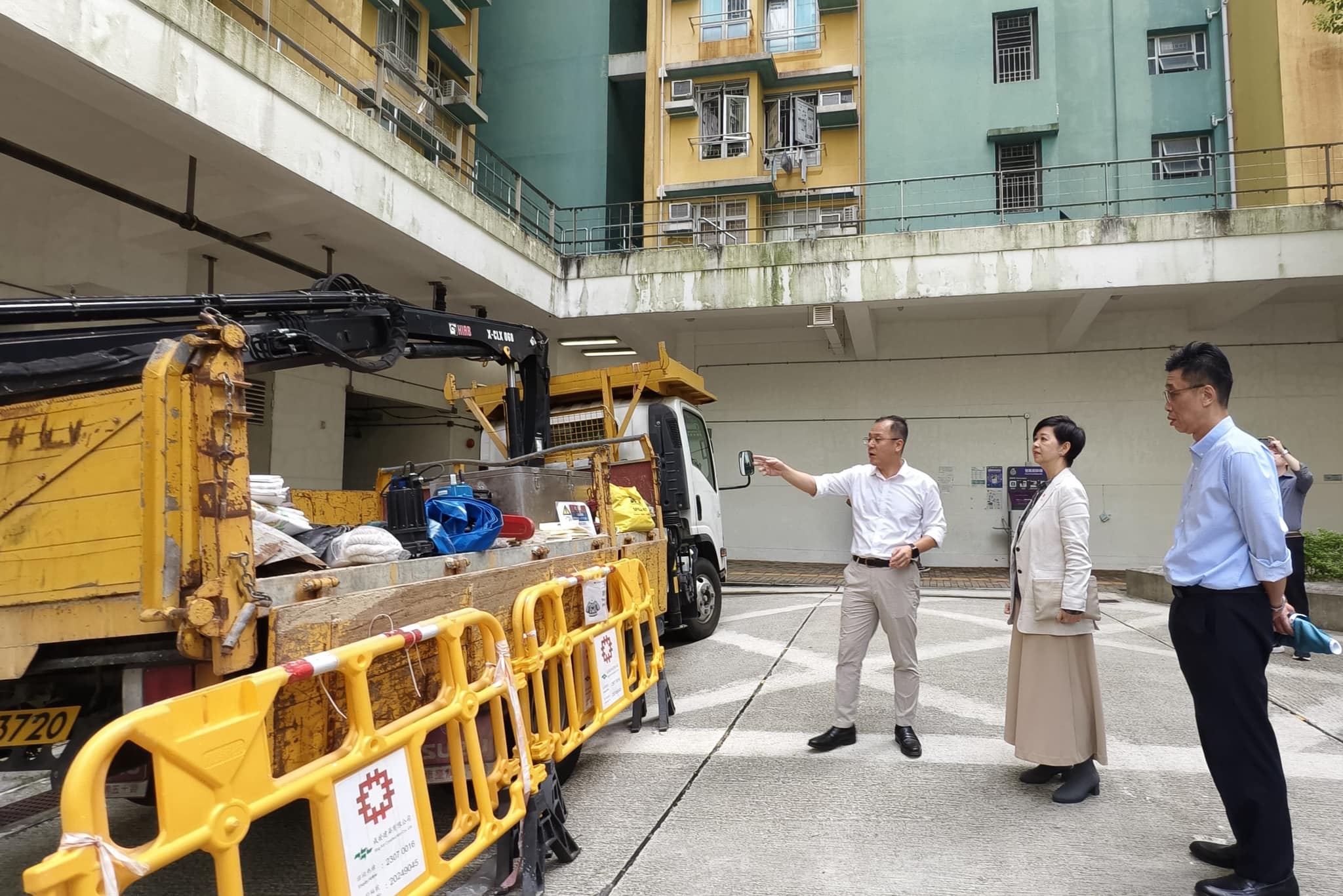 房屋局局長何永賢今日(22日)先後前往安泰邨、黃大仙上邨及薄扶林華景街地盤,看到同事檢查緊急應變裝備車、固定及鎖好戶外裝備、在電梯和機房等高風險位置已放好沙包;又檢查和清理排水渠,並在外圍地方清理不少容易阻塞渠道的淤泥。在棚架多的地盤,承建商亦已陸續在做防風措施,包括撤走雜物、捲起棚架上的隔音布,並將陸續收起紗網,盡量減低風阻。