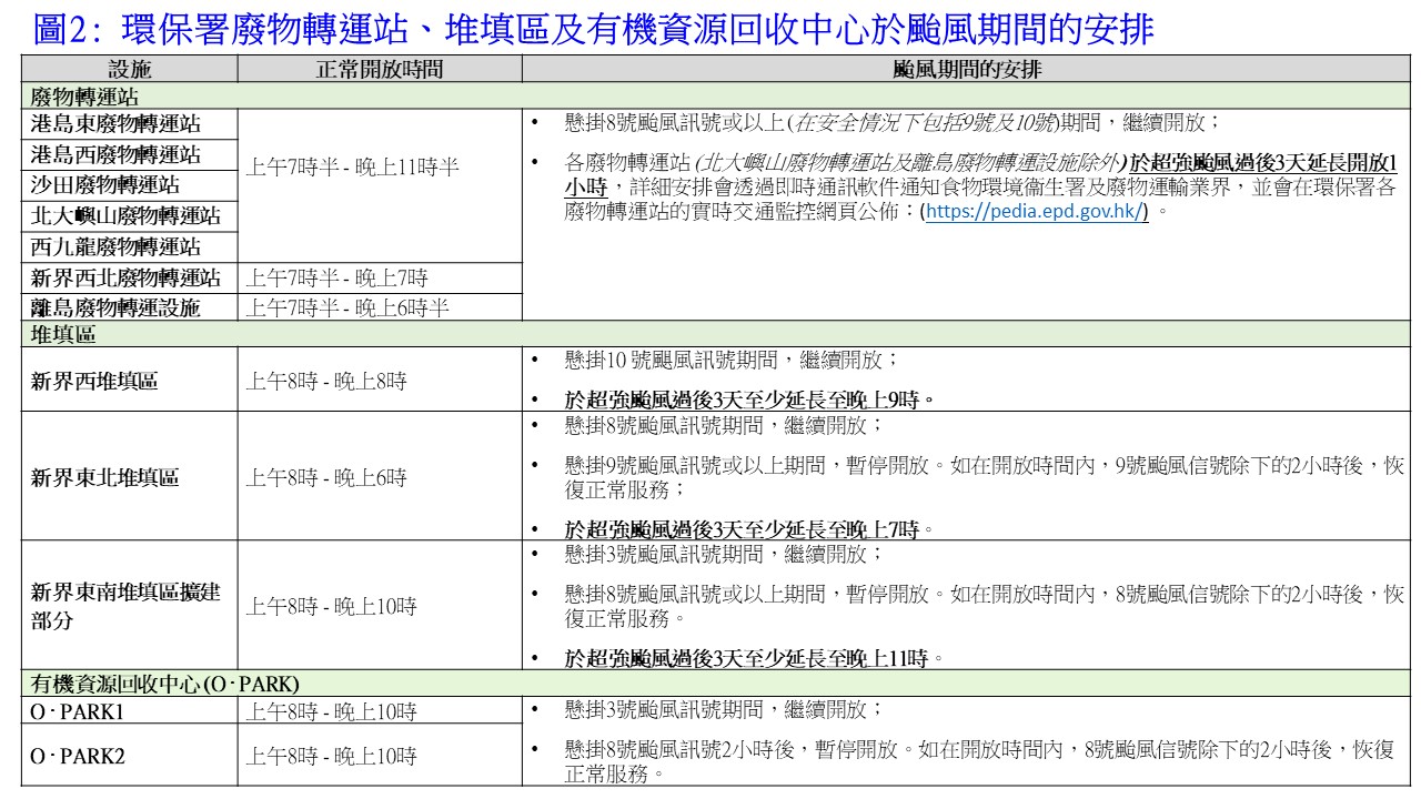 為協助政府及業界於颱風後迅速處理塌樹及廢物以盡快復常,環境保護署已於過往多天與廢物運輸業界保持緊密溝通,並採取多項措施以盡力減輕風暴可能帶來的影響,包括:預留充足的臨時木料廢物收集區,以接收及暫存因颱風襲港所收集的塌樹廢物,及預早準備應急的鋸木及碎木機,以協助盡快清理塌樹廢物;安排在超強颱風過後的3天,延長各市區廢物轉運站、新界西、新界東南及新界東北堆填區的開放時間至少1小時。