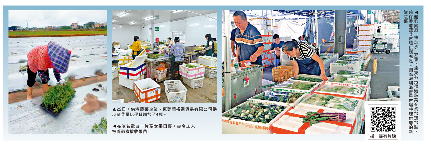 颱風前夕,香港市民未雨綢繆,到超市、街市選購新鮮蔬菜和食物以儲備。有超市的蔬菜貨架迅速被掃空。記者採訪多家廣東供港蔬菜企業了解到,各大供港菜基地除了加緊時間趕在颱風到來前搶收蔬菜,防止新鮮蔬菜被破壞,在出貨供港方面也加大馬力,不少企業的日供量比平時增加兩到三成。有企業負責人表示,無論風雨,都要保證香港市場的貨架上有菜賣,確保香港市場菜價維持平穩。