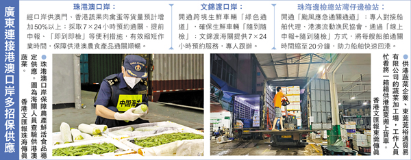 據介紹,莞裕通公司的加工場目前每日向香港供應蔬菜約70噸,另有水果20多噸,合計近百噸。胡先生表示,供港蔬菜加工場內每日依然出口基本訂單,而香港的老闆一般因應市場的需求量,大部分在下午密集加單,最遲晚上十點前車輛必須經文錦渡關口過關。「由東莞去到香港市場,大概一個半鐘頭車程,文錦渡過關後再到香港的客戶手裏,大概1小時至1.5小時,很便捷。」他說,連日加車會令裝卸稍為延長,但整體運作仍然順暢。