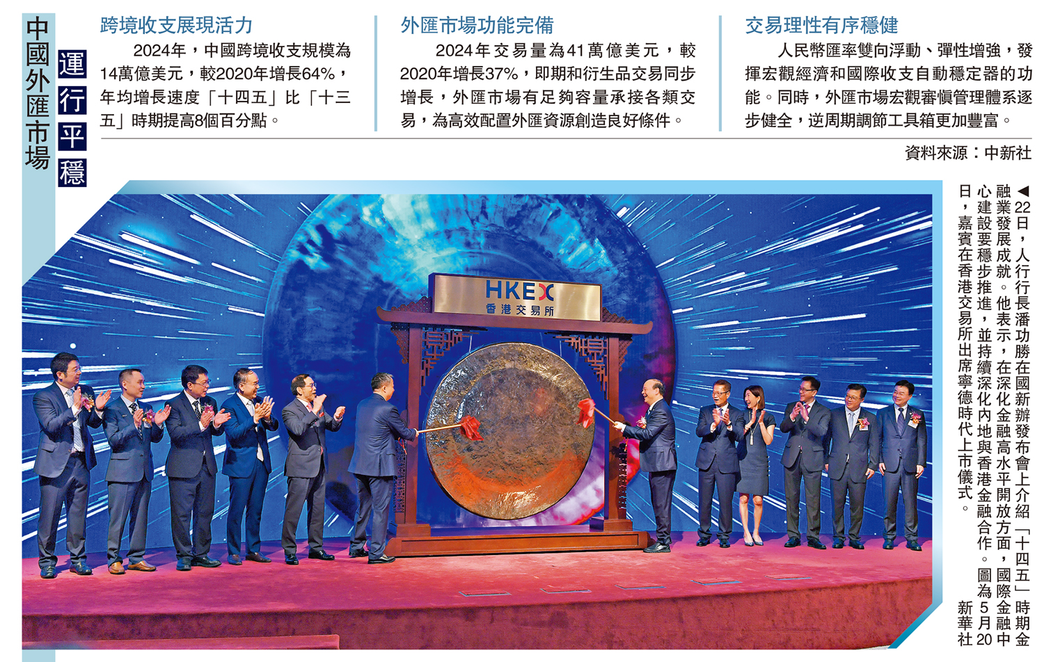 中國人民銀行副行長、國家外匯局局長朱鶴新介紹,「十四五」以來,外匯市場交易理性有序,穩健性增強,人民幣匯率上下浮動彈性增強,發揮了宏觀經濟和國際收支自動穩定器的功能。人民幣在跨境貿易中使用佔比由16%上升到近30%,反映外匯市場韌性進一步增強。他亦提到,支持上海、香港國際金融中心建設,在自貿試驗區、海南自貿港、粵港澳大灣區等重點區域先行先試外匯創新政策。