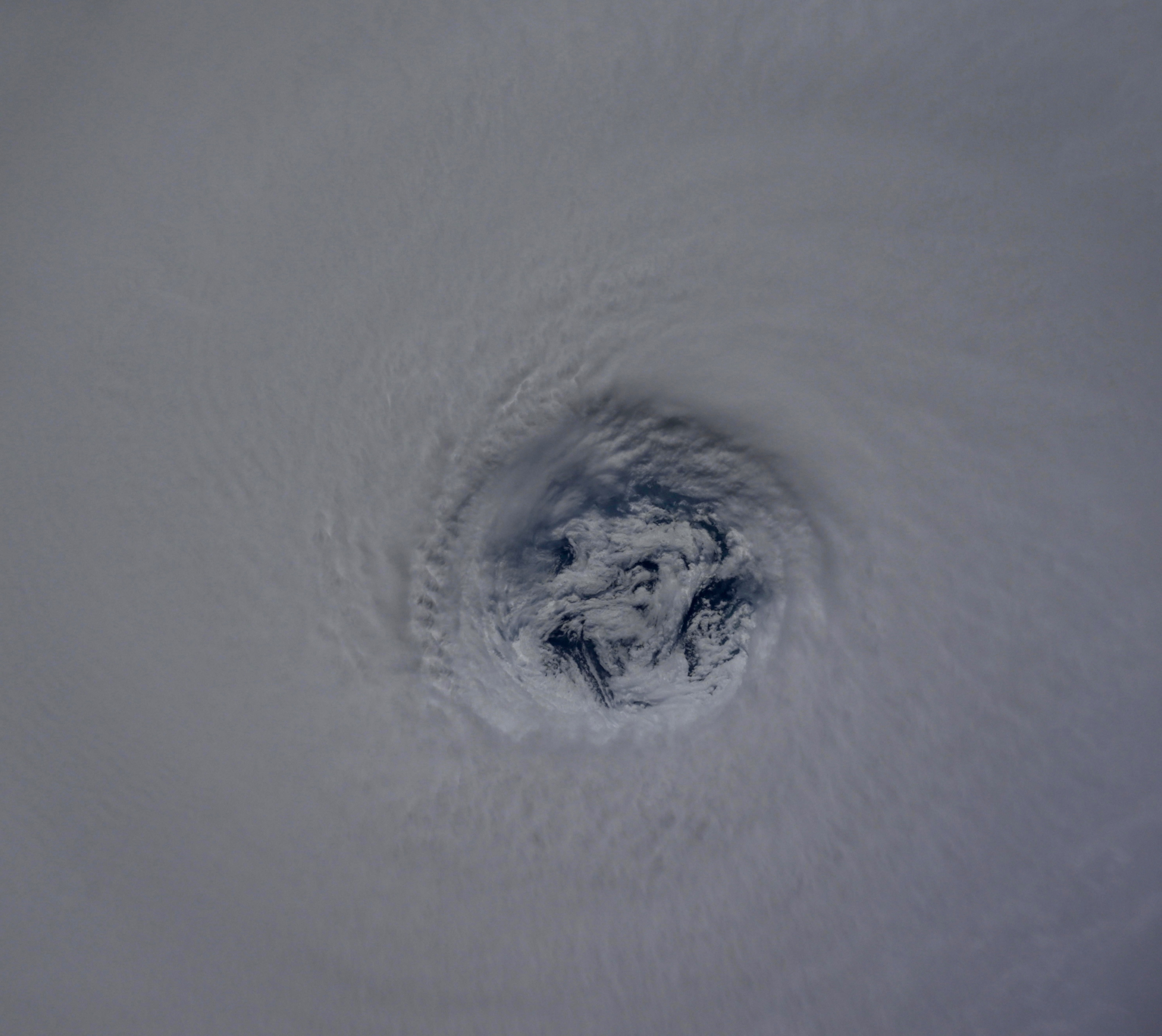從太空俯瞰,颱風眼與緊密的雲朵環流形成了一個巨大的白色漩渦。厚重的雲牆宛如活物般盤踞在海面上,這種從太空俯瞰的視角一覽無餘地展示了颱風的震撼力與自然界的力量。