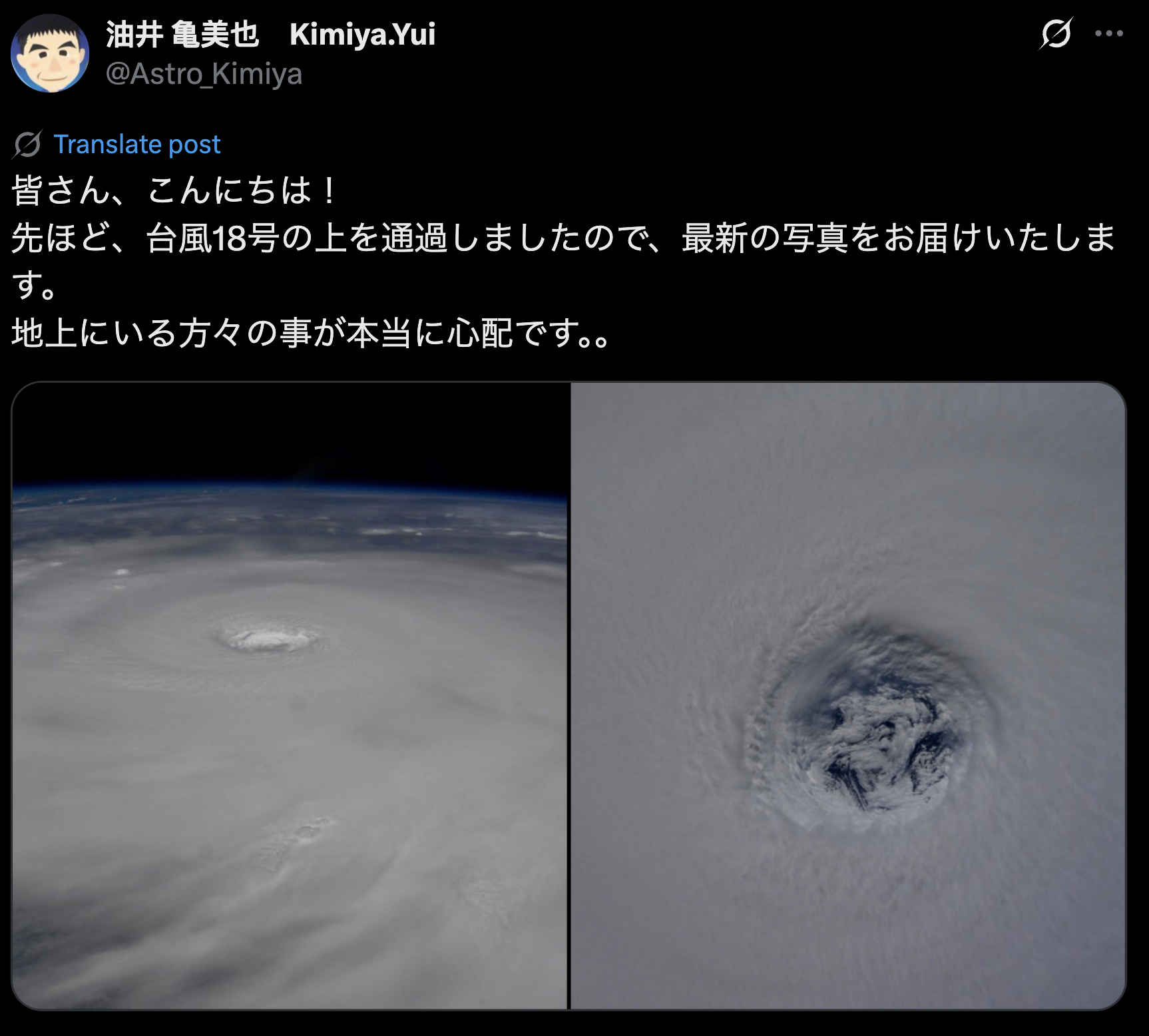 大公文匯全媒體報道,超強颱風「樺加沙」來勢洶洶,破壞力隨時直逼2017年「天鴿」及2018年「山竹」。9月22日,日籍航天員油井龜美也從國際空間站捕捉到了到颱風「樺加沙」的壯觀景象,他在X平台發布照片並表示:「國際空間站剛好飛越樺加沙上空,把最新畫面傳給大家。我真的很擔心地面上大家的情況。」