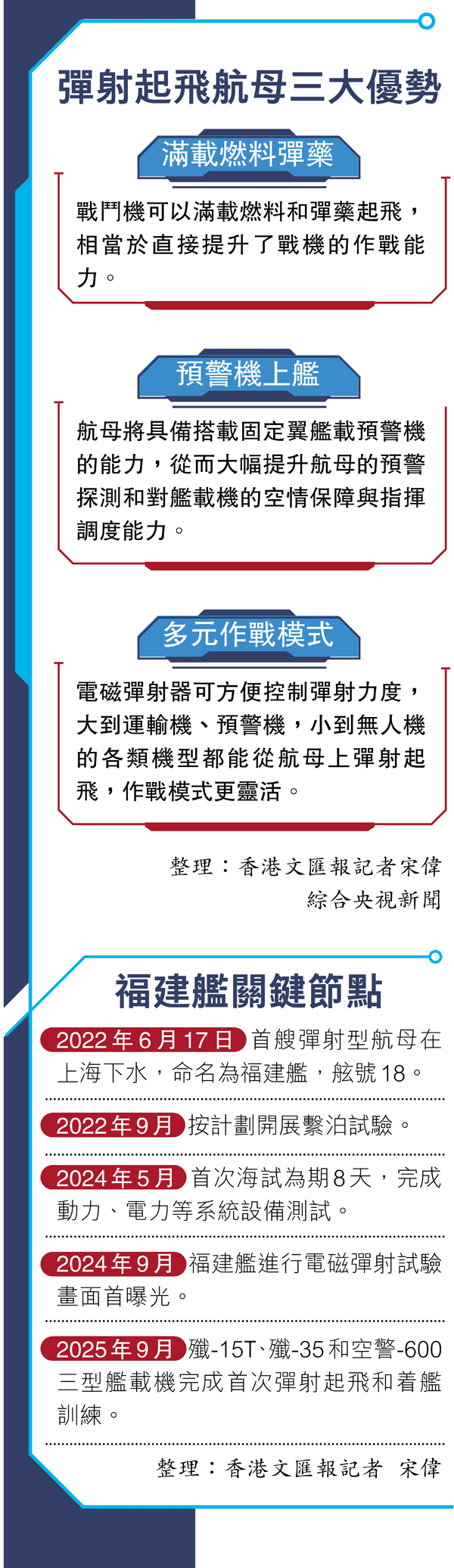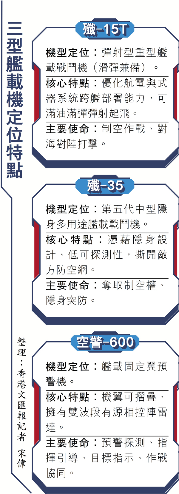 (香港文匯報記者 宋偉)據央視新聞22日報道,在九三閱兵上受閱的殲-15T、殲-35和空警-600三型艦載機,已於此前完成在福建艦上首次彈射起飛和着艦訓練,標誌着福建艦具備了電磁彈射和回收能力。這也是中國首次在彈射型航母上實現多型號先進艦載機的電磁彈射和阻攔着艦。有軍事專家表示,此次試驗試訓的成功,是艦載機與航母核心技術的「雙向賦能」。隨着越來越多型號艦載機上艦運用,中國航母編隊遠海作戰能力將實現「代際升級」。