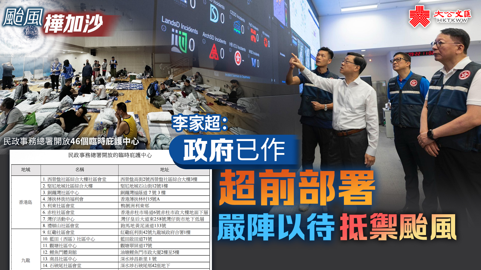大公文匯全媒體報道,行政長官李家超今日(23日)出席第十五屆中國—東盟成員國總檢察長會議時致辭指,超強颱風「樺加沙」襲港,預計天氣會急劇惡化,為社會帶來威脅,政府已作超前部署,加強預防措施,同時安排應急小組待命。他指,昨日已啟動緊急事故監察及支援中心,中心比平常提前超過24小時啟動,以實時監測城市情況、進行風險評估並制定措施;昨日亦已提早宣布學校今明兩日停課;所有臨時收容中心亦在早上全面投入運作。