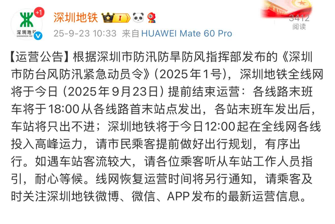 根據深圳市防汛防旱防風指揮部發布的《深圳市防颱風防汛緊急動員令》(2025年1號),深圳地鐵全線網將於今日(2025年9月23日)提前結束運營。