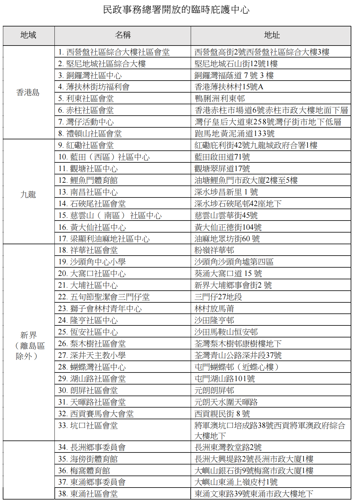 民政事務總署表示,各區民政事務處會密切留意情況,如有需要,個別臨時庇護中心亦會提早運作。如有查詢,可致電民政事務總署熱線2572 8427。