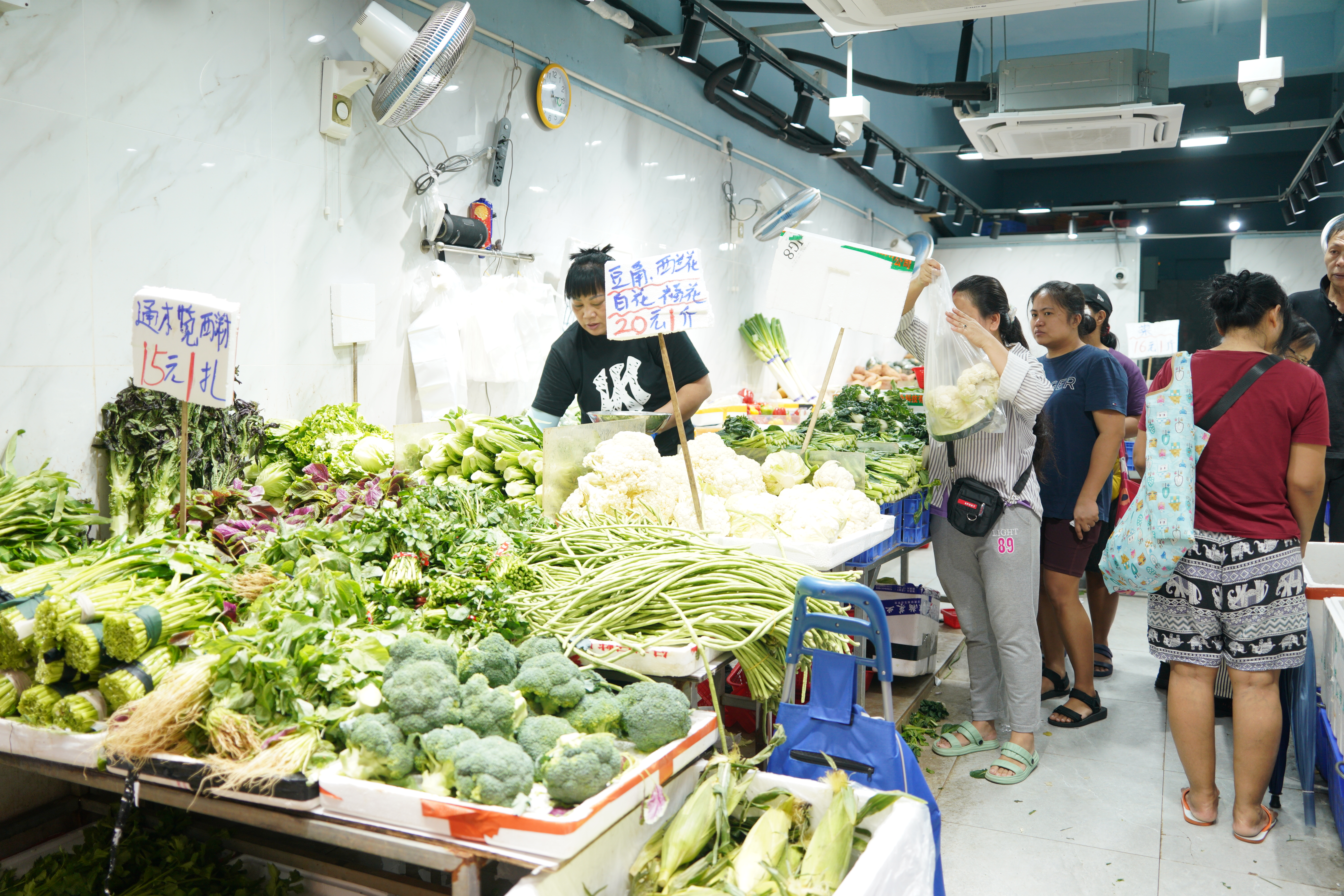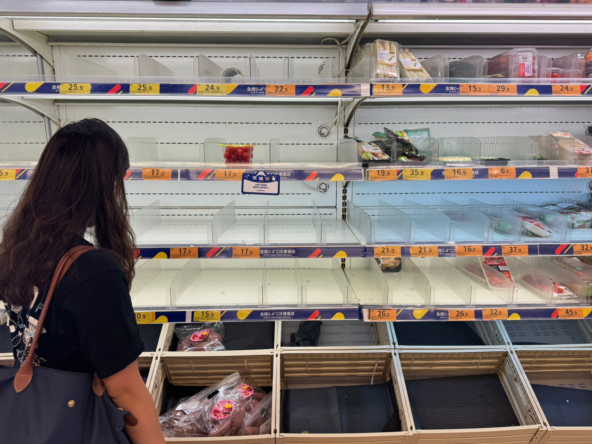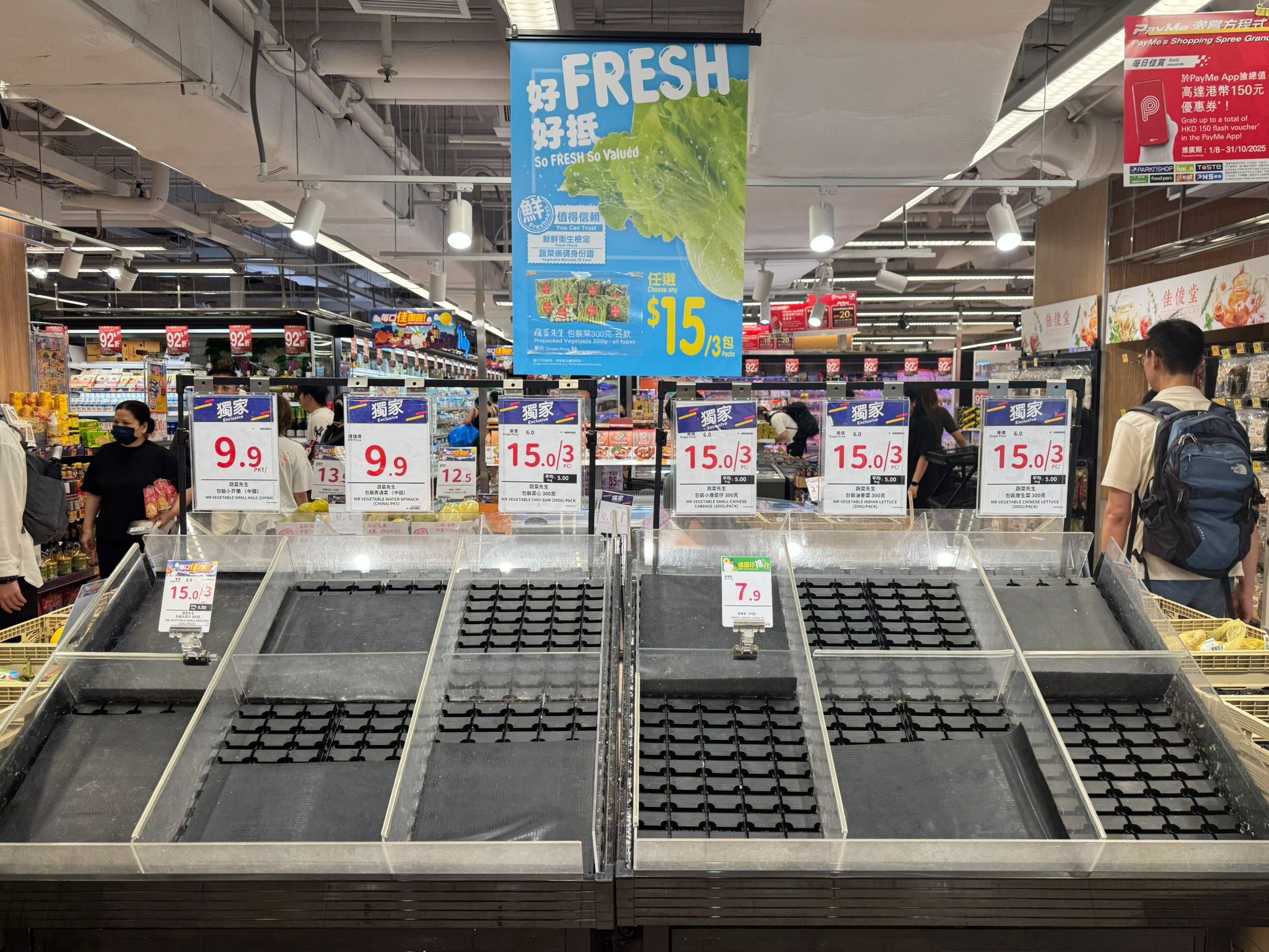點新聞記者今日上午再度走訪多個街市與超級市場。今早9時半許,堅尼地城一間百佳超市,蔬果類貨架已清空,收銀處大排長龍,年輕人購物車中以方便麵及速凍食品為主。上午11時許,灣仔街市運行如常,貨品供應量暫時充足,菜價亦回落到平常水平,一斤大約16蚊至20蚊,部分菜品22蚊有兩斤。