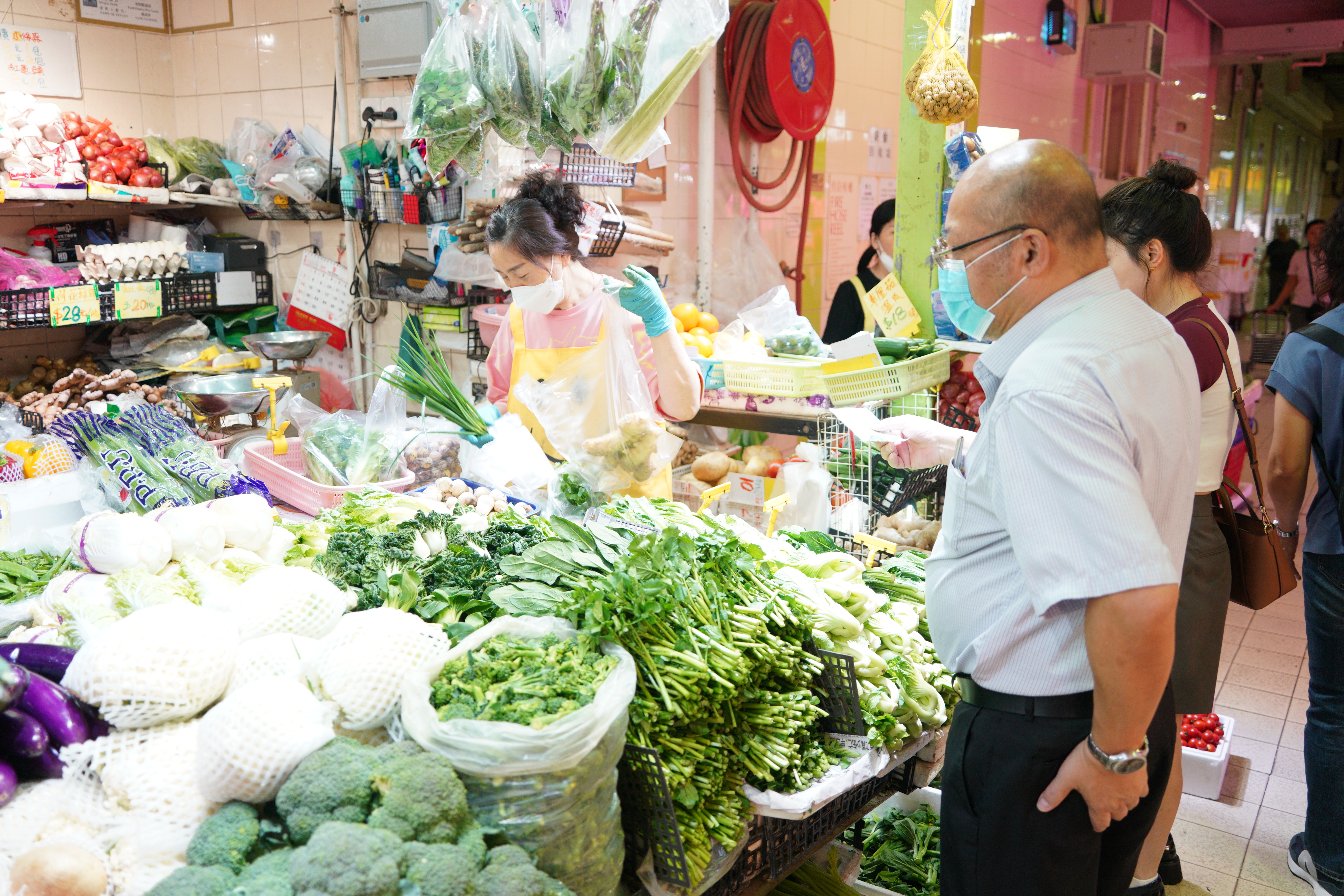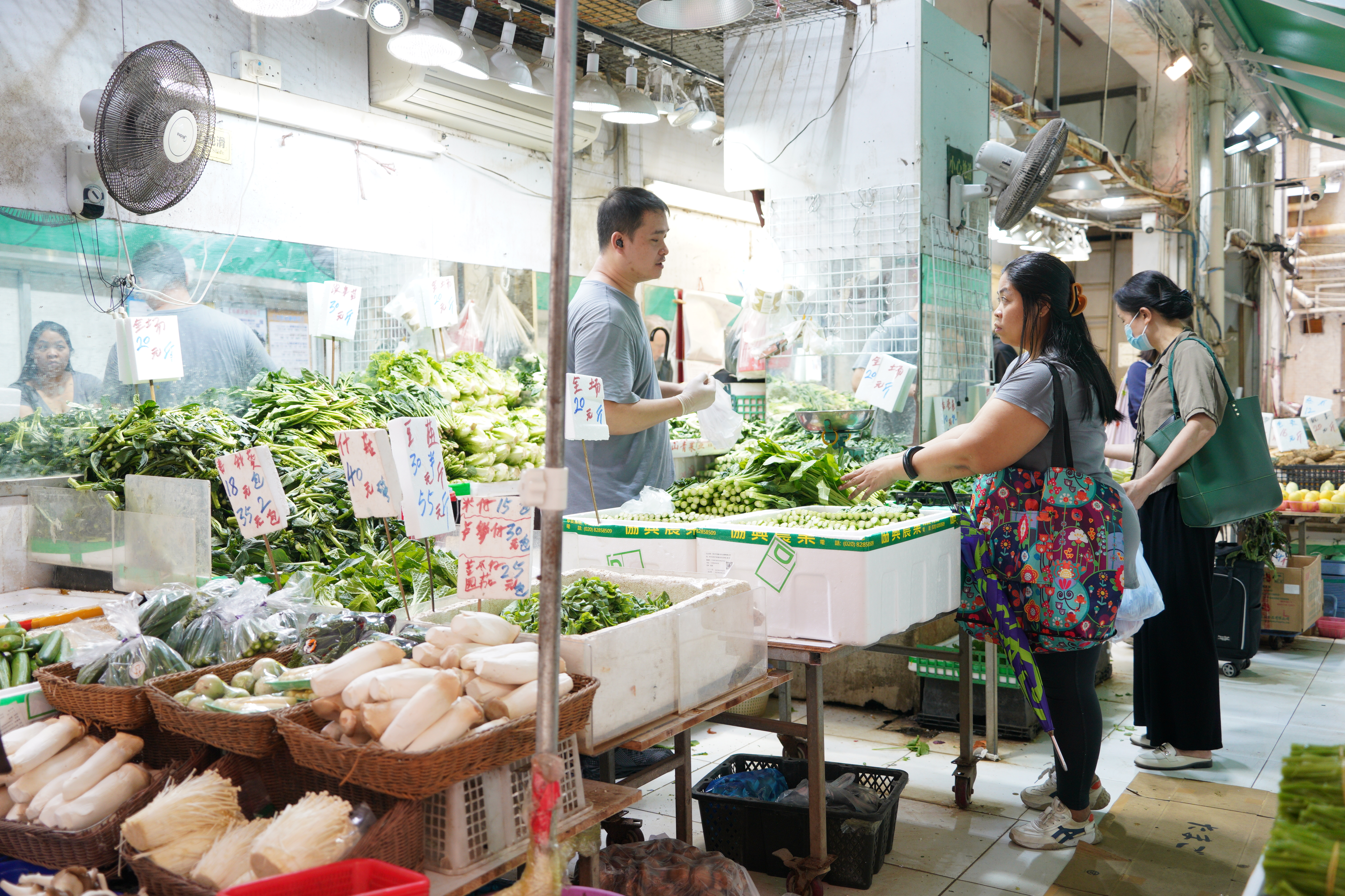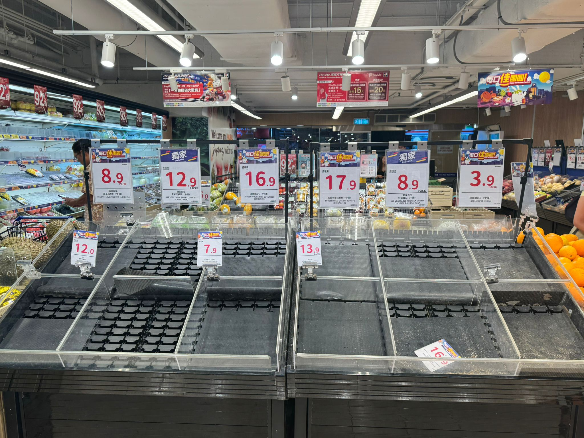 點新聞記者今日上午再度走訪多個街市與超級市場。今早9時半許,堅尼地城一間百佳超市,蔬果類貨架已清空,收銀處大排長龍,年輕人購物車中以方便麵及速凍食品為主。上午11時許,灣仔街市運行如常,貨品供應量暫時充足,菜價亦回落到平常水平,一斤大約16蚊至20蚊,部分菜品22蚊有兩斤。