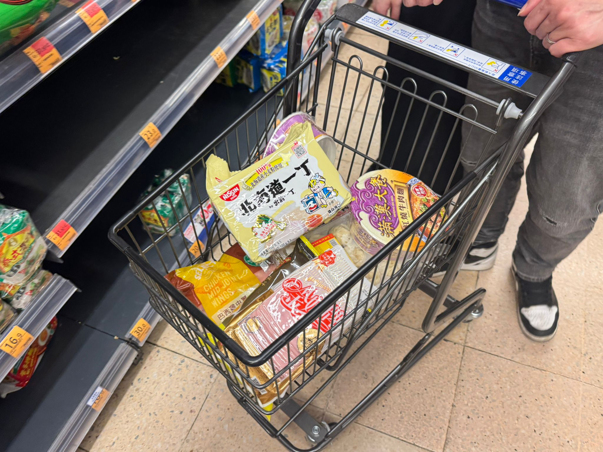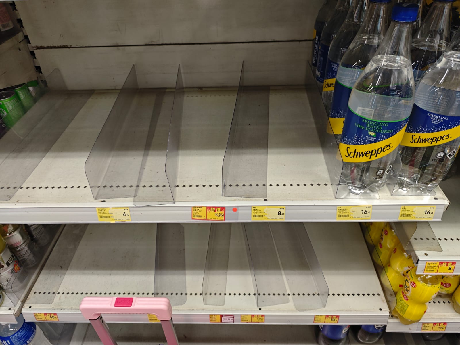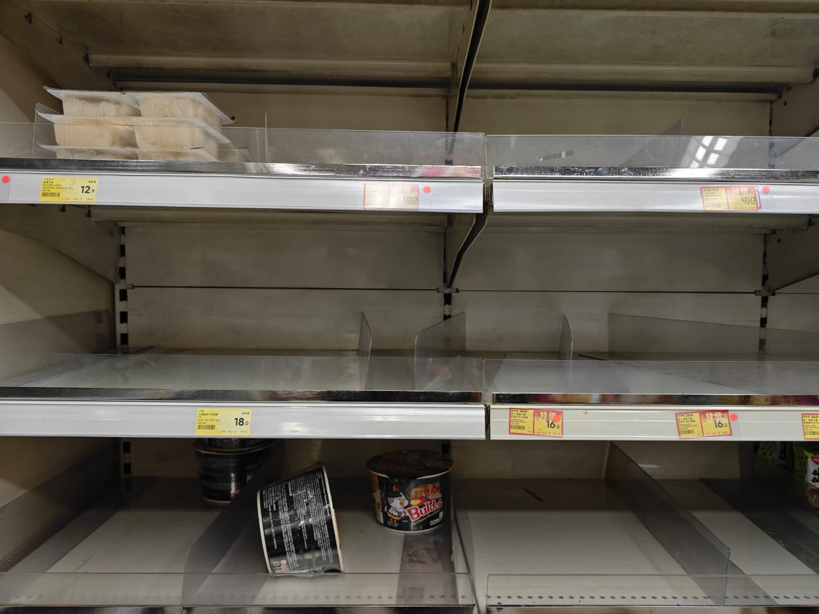 昨晚,點新聞記者探訪深水埗一間惠康,純淨水已售罄,貨櫃上儘剩氣泡水;即食麵貨櫃上亦只剩兩個火雞面。