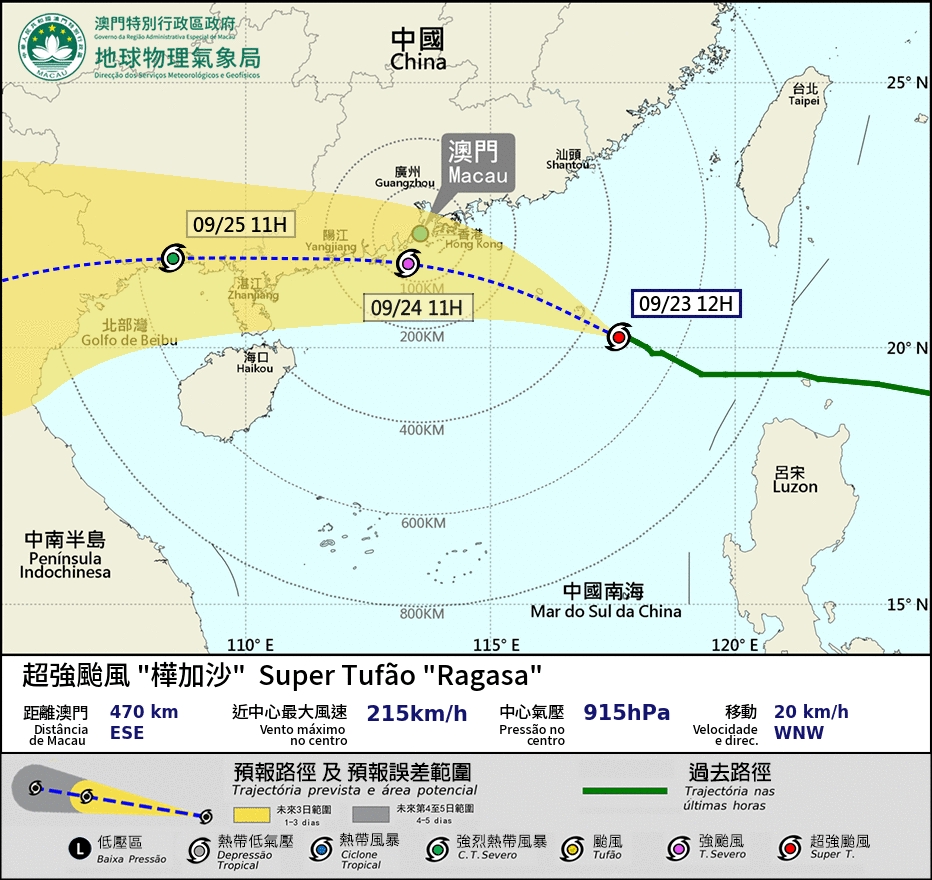 澳門氣象局今日稍早時候表示,明日凌晨改發九號風球機會為高,同日清晨改發十號風球機會為較高。澳門氣象局還表示,不排除「樺加沙」於澳門100公里內掠過。