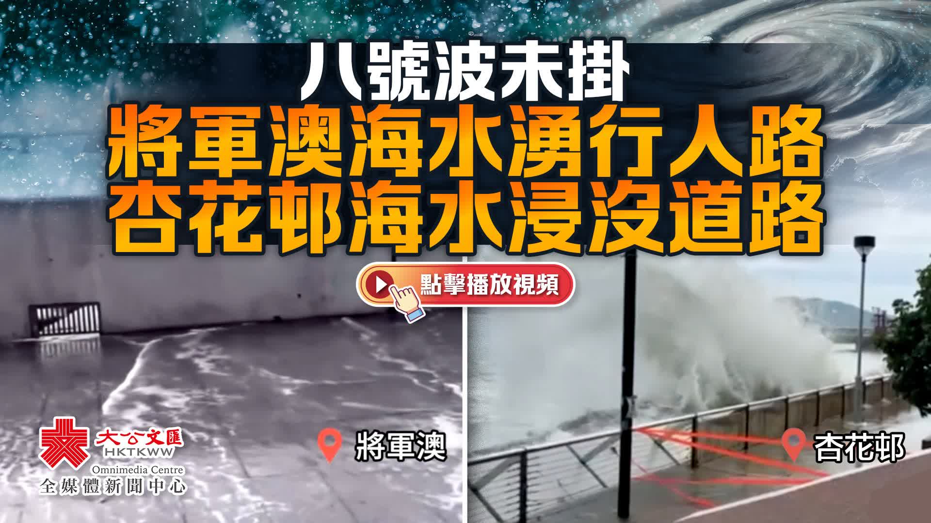 雖八號波尚未懸掛,已有市民看到,將軍澳海水已經湧上行人路;還有市民看到,杏花邨風未至浪先到,水位高漲,海水亦已浸沒部分行人路;在大浪灣亦可見,海浪愈發猛烈。