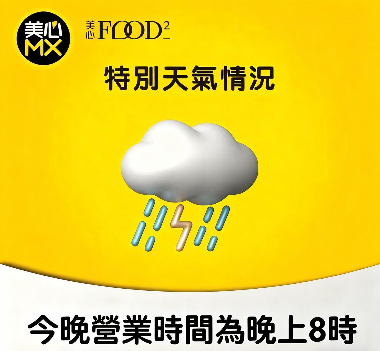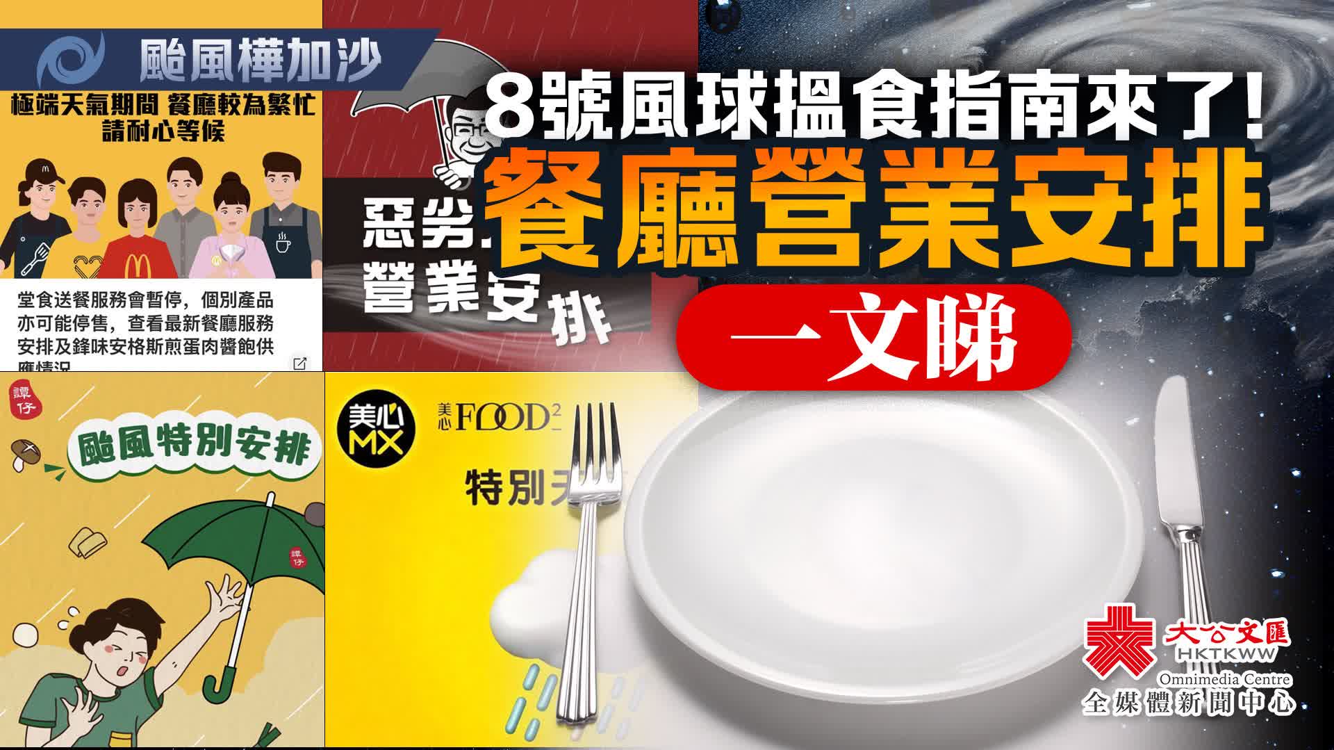 美心表示,在8號風球下,所有門店都會營業至晚上8時,部分門店晚市會營業至晚上9時30分至10時。