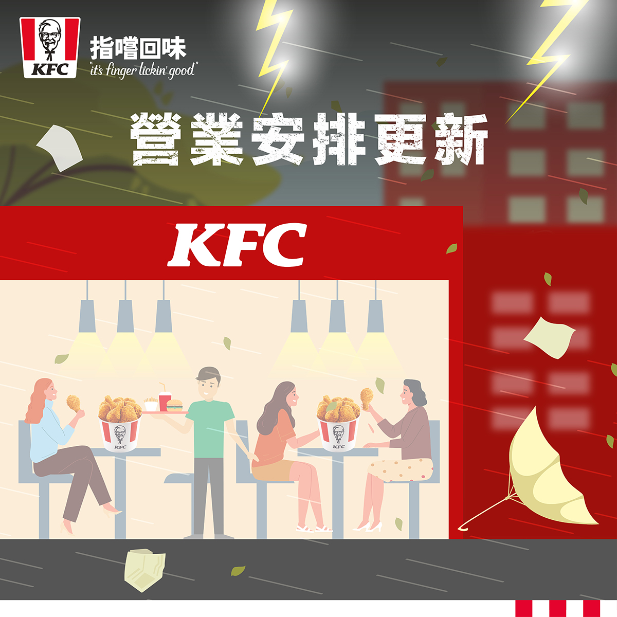 肯德基表示,由於八號烈風或暴風信號下午2時20分生效,肯德基「快脆送」外送服務於下午1時起全面暫停。不過,大部分肯德基分店的堂食、外帶自取及「快脆拎」服務仍會按照正常營業時間繼續提供,詳情可瀏覽網站。