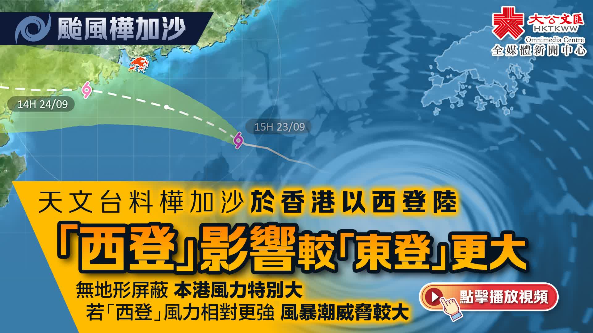 大公文匯全媒體報道,天文台今日(23日)在社交專頁表示,「樺加沙」將維持超強颱風的強度,預料會在明早(24日)最接近珠江口一帶,隨後在香港以西登陸,而「西登」對香港的影響較「東登」更大。