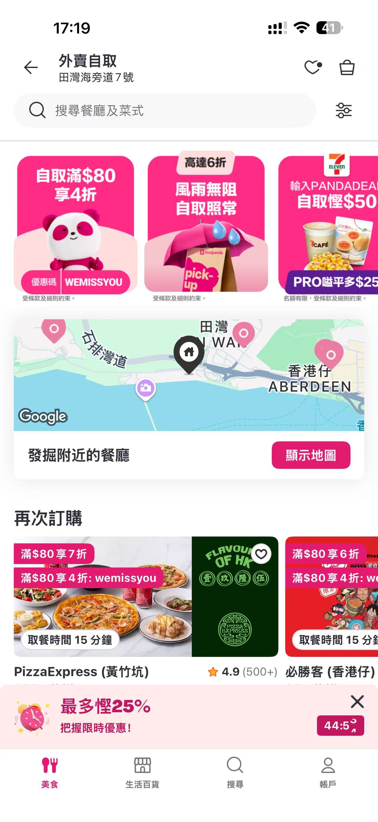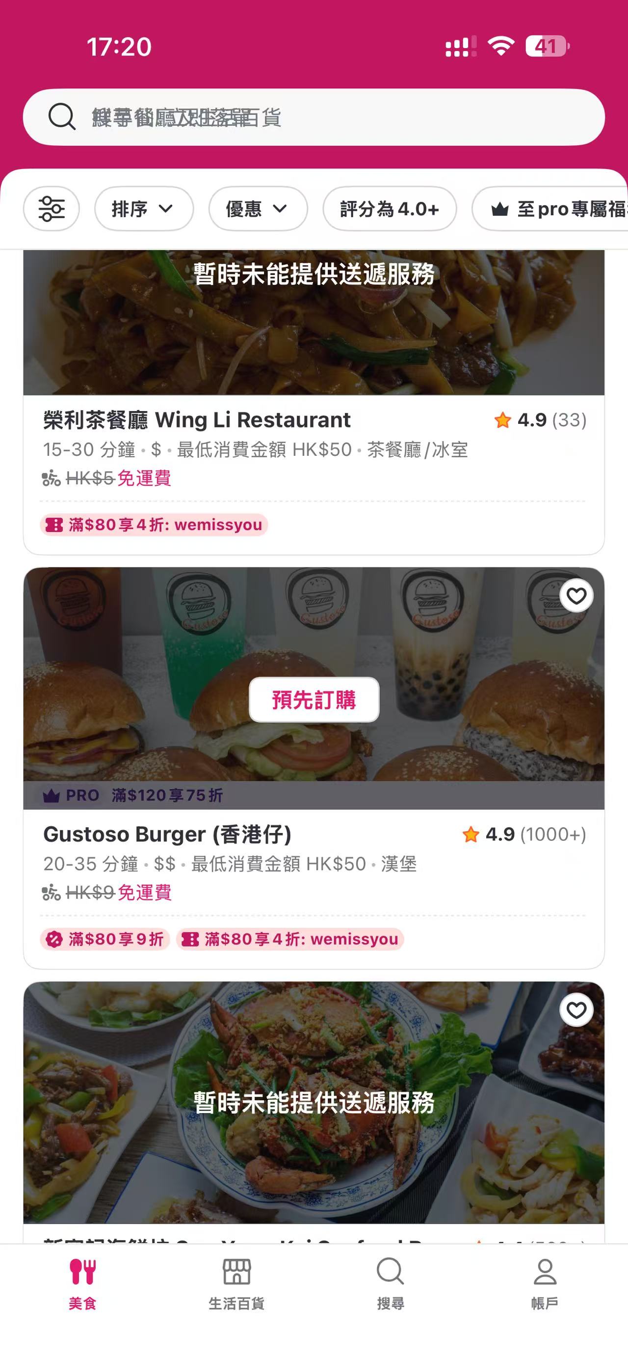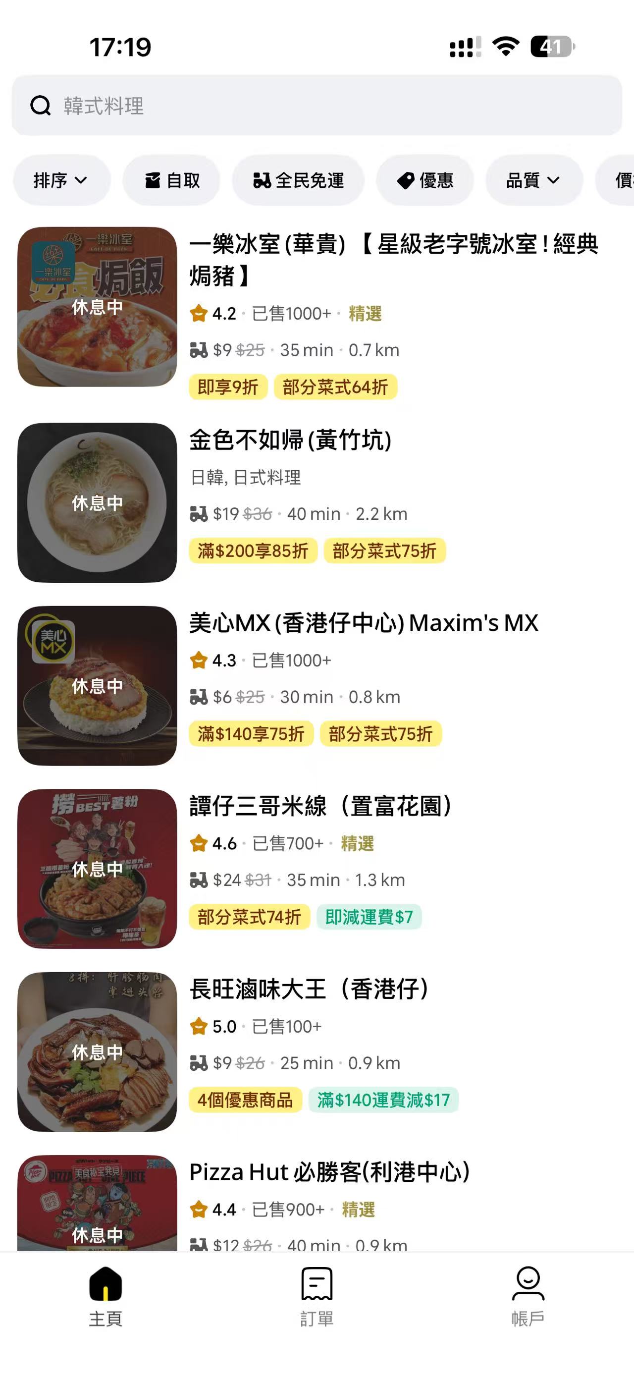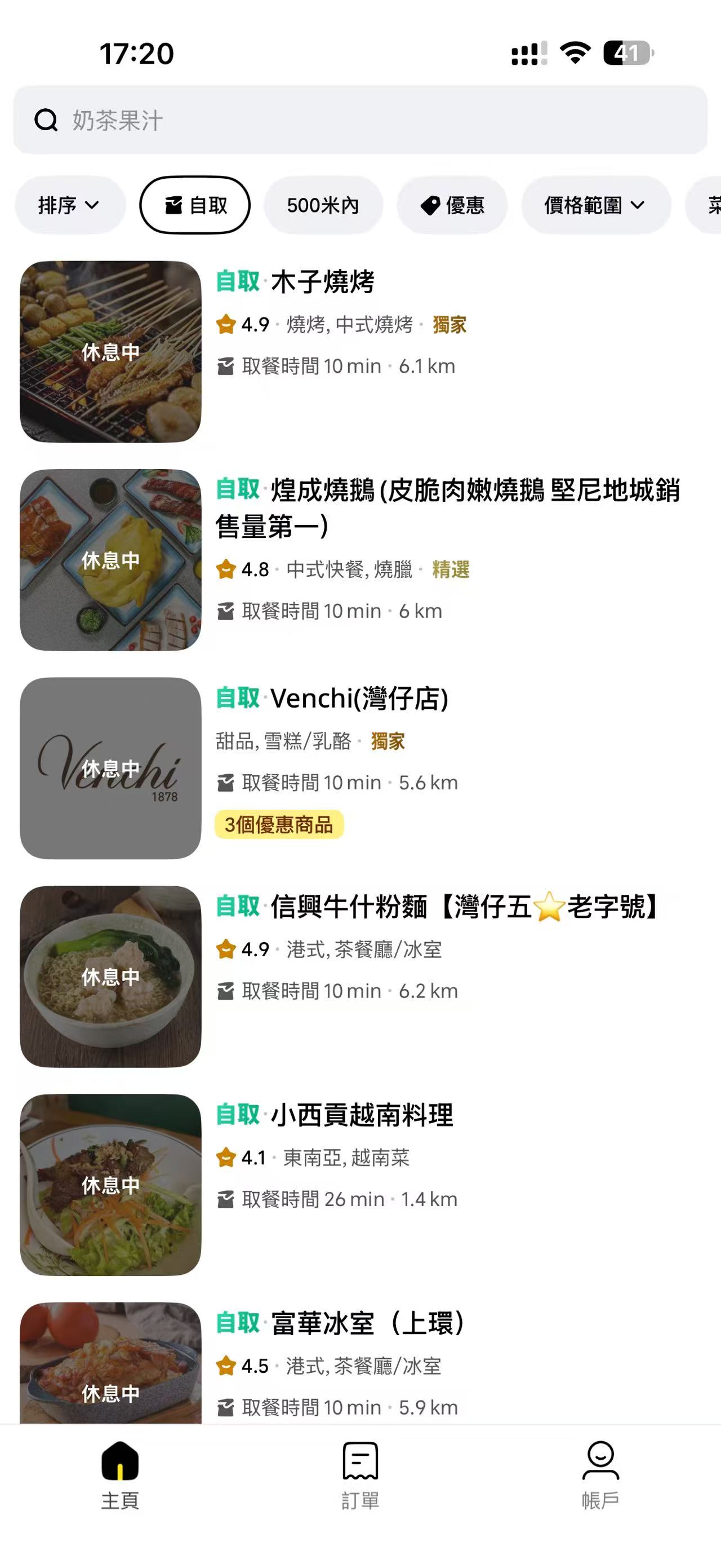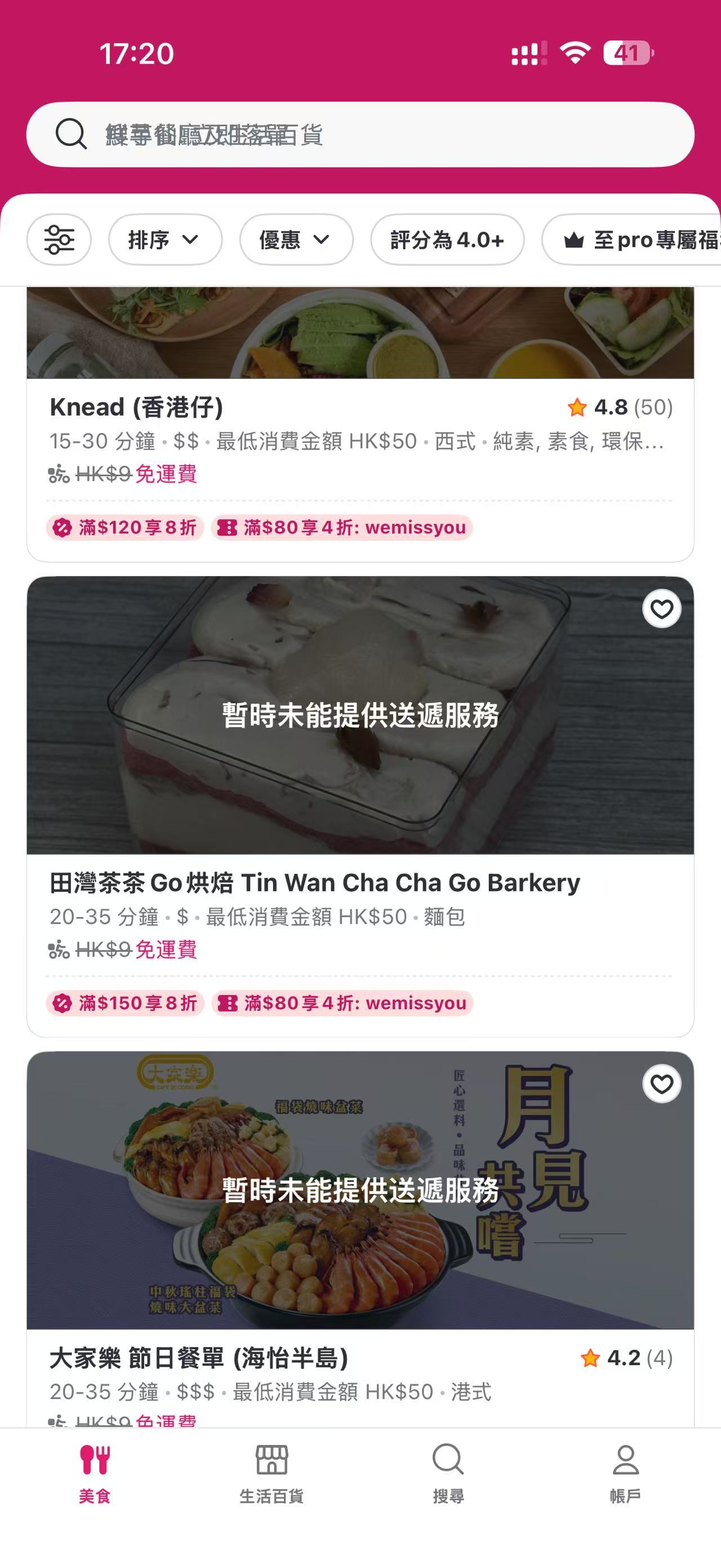 大公文匯全媒體記者所見,兩個平台幾乎所有餐廳顯示休息中或暫停送餐服務。在keeta選擇自取時大部分餐廳顯示休息中,foodpanda則提供自取六折優惠,在自取界面有部分餐廳能下單點餐。
