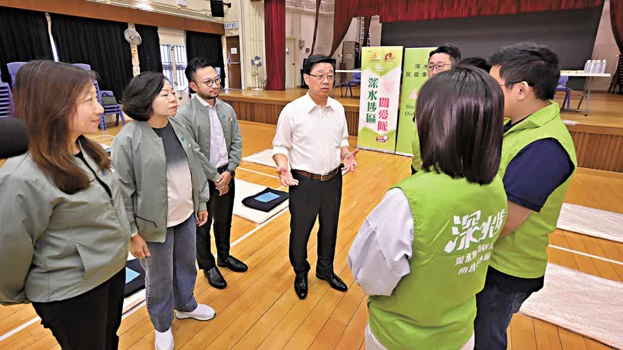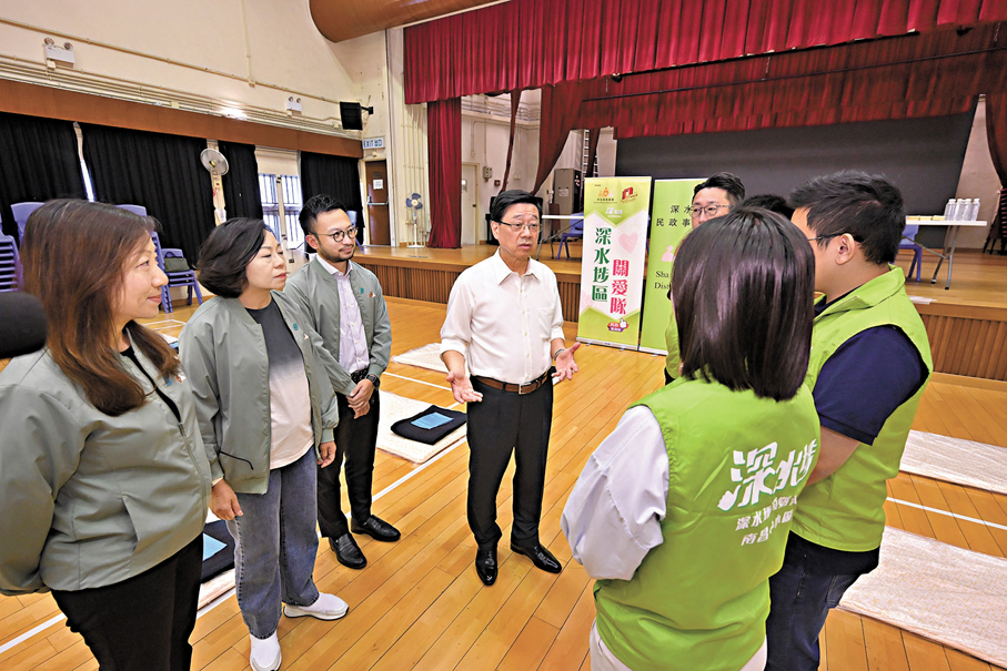 其後,他在民政及青年事務局局長麥美娟及民政事務總署署長杜潔麗陪同下前往南昌社區中心,視察提早於上午8時開放的南昌臨時庇護中心,聽取深水埗民政事務專員王浩宇介紹中心設備及入住流程。