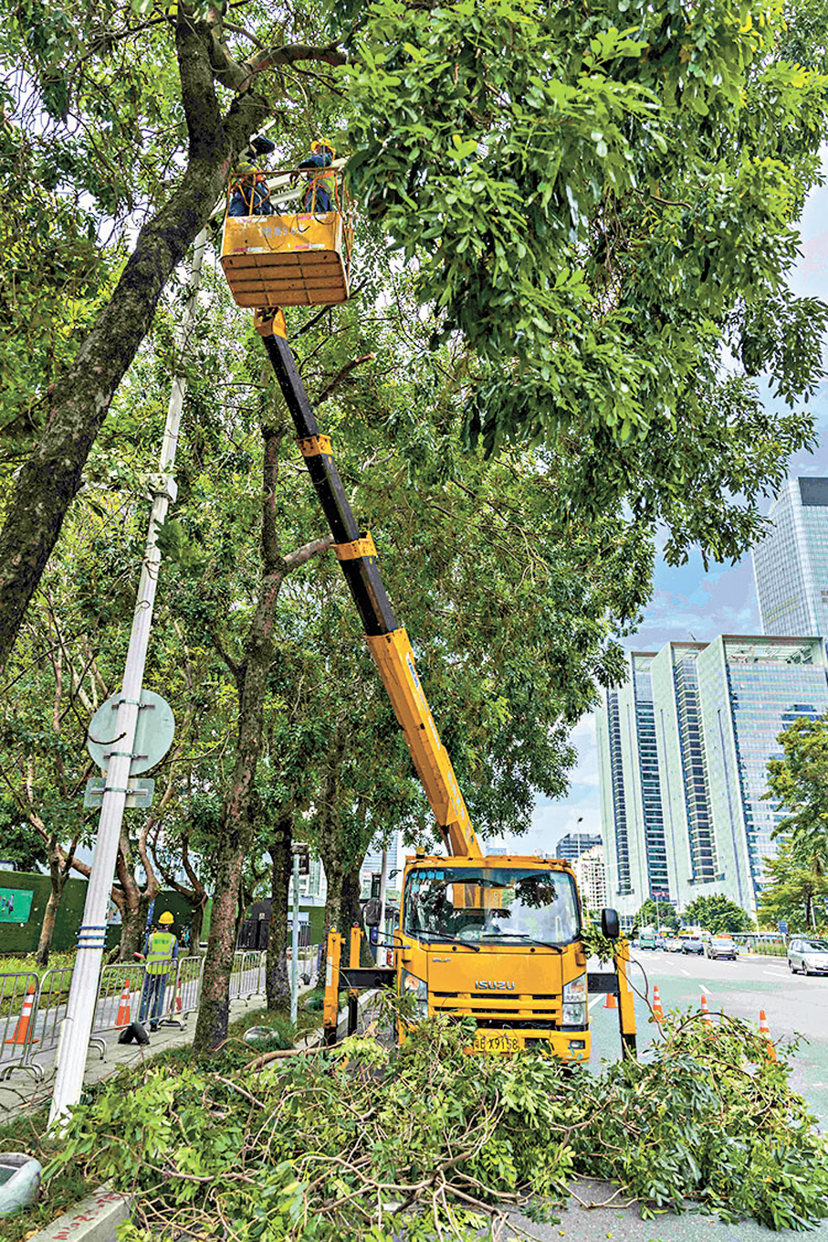 城管部門作為城市安全防護的「先鋒隊」,第一時間投入到防風隱患排查工作中。香港文匯報記者從深圳市城市管理和綜合執法局獲悉,截至9月23日15時,全市城管領域共排查樹木107.97萬株,其中修剪4.82萬株、加固12.5萬株、清理病險樹木1,680株。同時,深圳市市容景觀中心組織各區對戶外廣告、招牌設施開展全面排查。入汛以來,共巡查戶外廣告9.63萬個、招牌30.41萬個,發現設施安全隱患1,381處,其中拆除709處,加固667處。