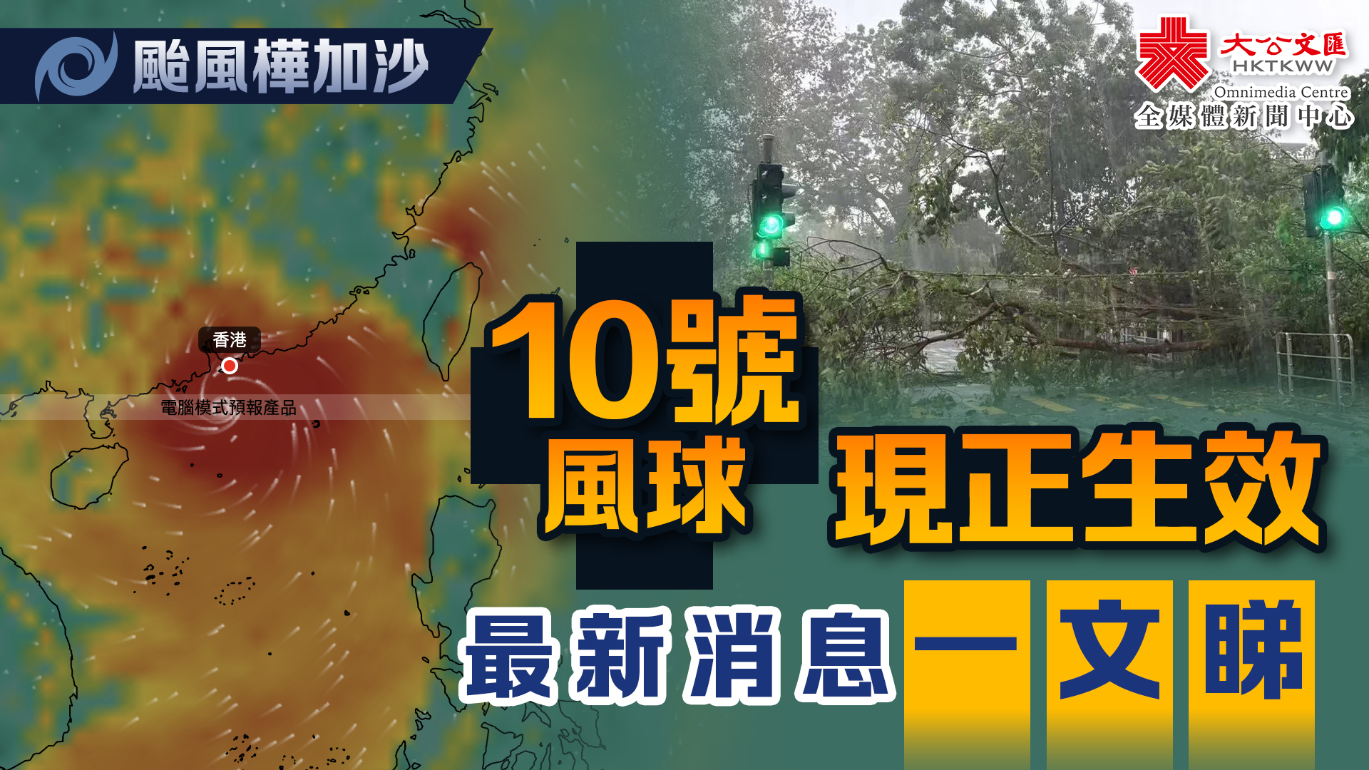 【09:45】天文台表示,「樺加沙」正開始遠離本港,但與其相關的颶風仍間中影響本港西南部。十號颶風信號會維持一段時間。預料本港會逐漸轉吹東南風,市民需保持高度警覺,不要離開有屏蔽的地方並留意破壞性的風力。本港今日天氣會持續惡劣,有頻密狂風大驟雨及雷暴。海有極巨浪及湧浪,岸邊會出現越堤浪,東面及南面的海岸尤其顯著。市民應遠離岸邊及停止所有水上活動。