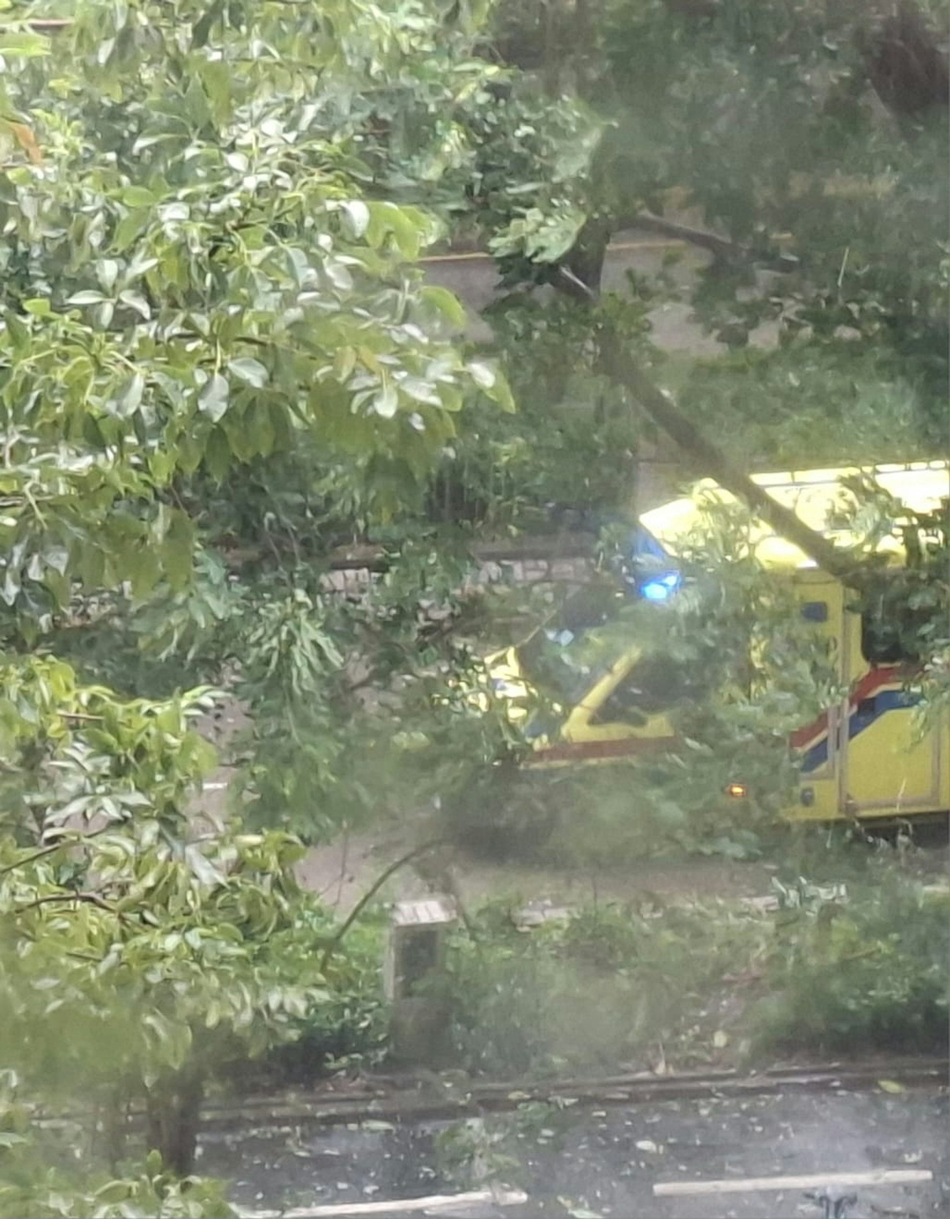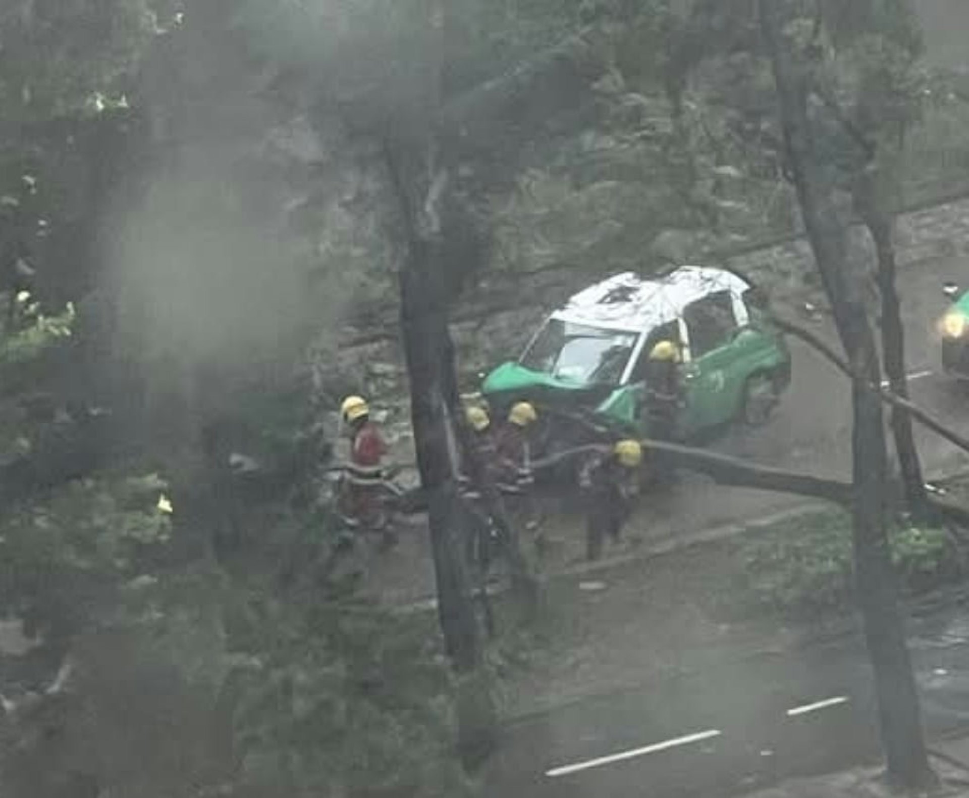 圖片可見,樹木塌下壓中的士車頭,車頭損毀變形,消防及救援人員到場施援。的士司機一度被困,需由消防員協助救出。