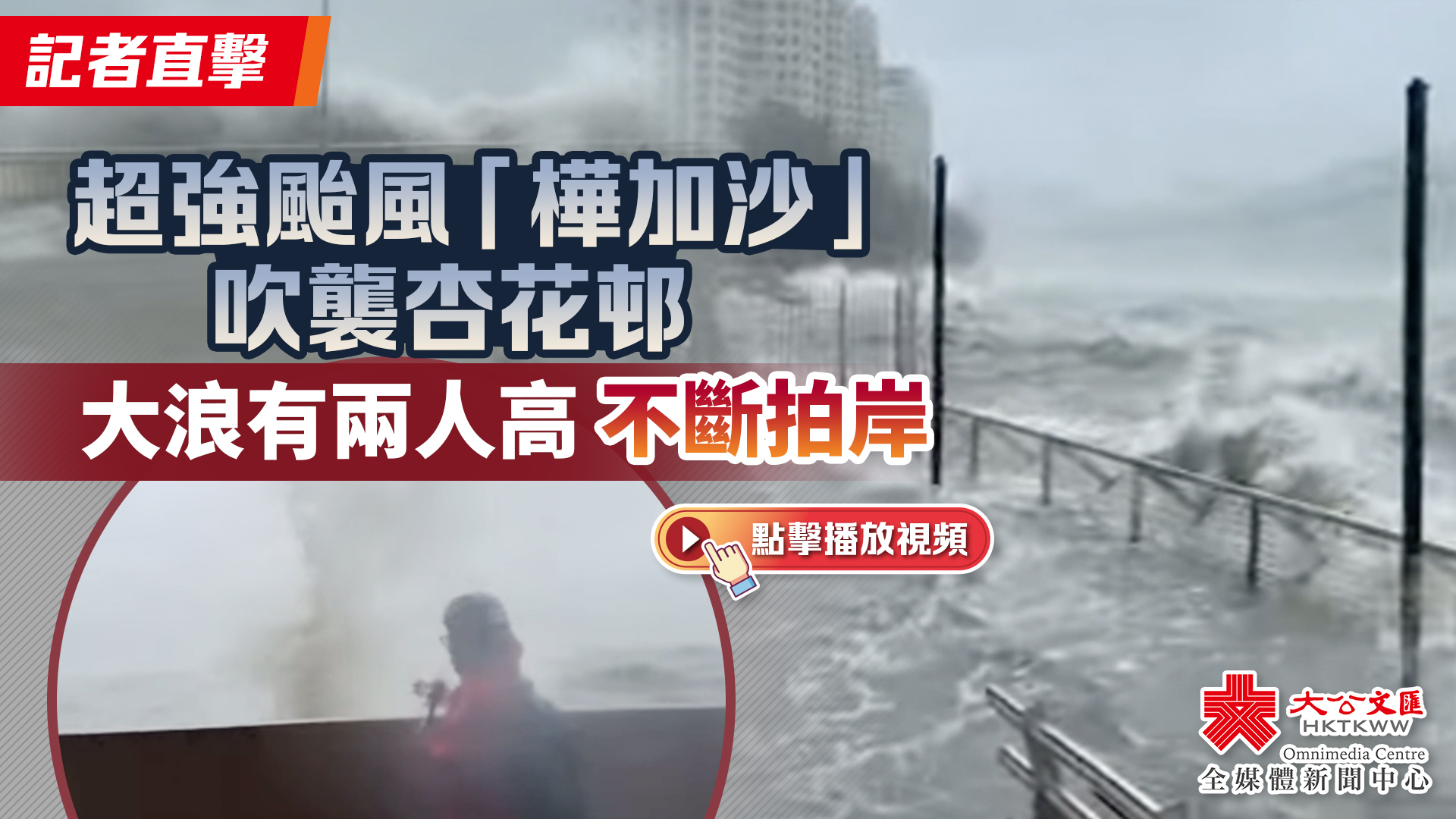 (大公文匯全媒體 王俊傑、劉妍伶)超強颱風「樺加沙」襲港,天文台今日凌晨2時40分發出十號颶風信號。每逢颱風侵襲香港之際,杏花邨都首當其衝。今日(24日)上午,點新聞直播團隊趕至現場,為大家直擊颱風最新情況。記者現場所見,地面上有不少殘枝碎葉,沿路樹枝散落,大風亦令行人無法順利前行,沿路防水板及行人路欄桿等均受到一定損壞,岸邊的行人路亦出現內陷,有機會是早前海水倒灌或其他原因所致。現場見到,大浪不斷拍至岸邊,浪高一度有兩人高,遠遠超過記者身高。