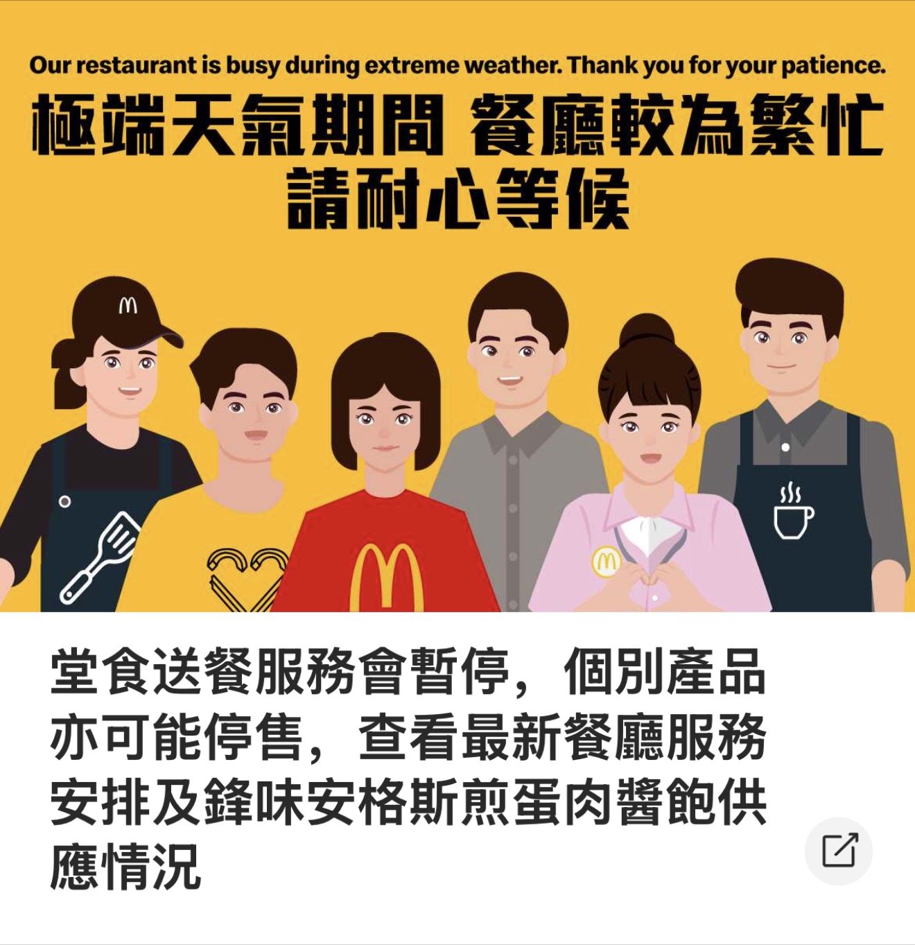 大公文匯全媒體報道,超強颱風「樺加沙」襲港,十號颶風信號仍生效。極端天氣下,本港多數餐飲店並未開門,紛紛選擇閉店歇業,惟以快餐主打的麥當勞等其他連鎖品牌開門迎客,麥當勞除旗下少數幾個分店關門外,幾乎全線開放。這不僅意味着香港人在颱風天能有穩定的外食選擇,也意味着香港麥當勞的員工需要在極端天氣下堅守在一線。
