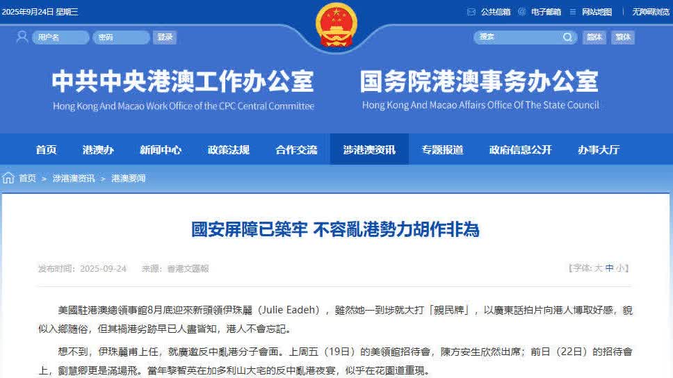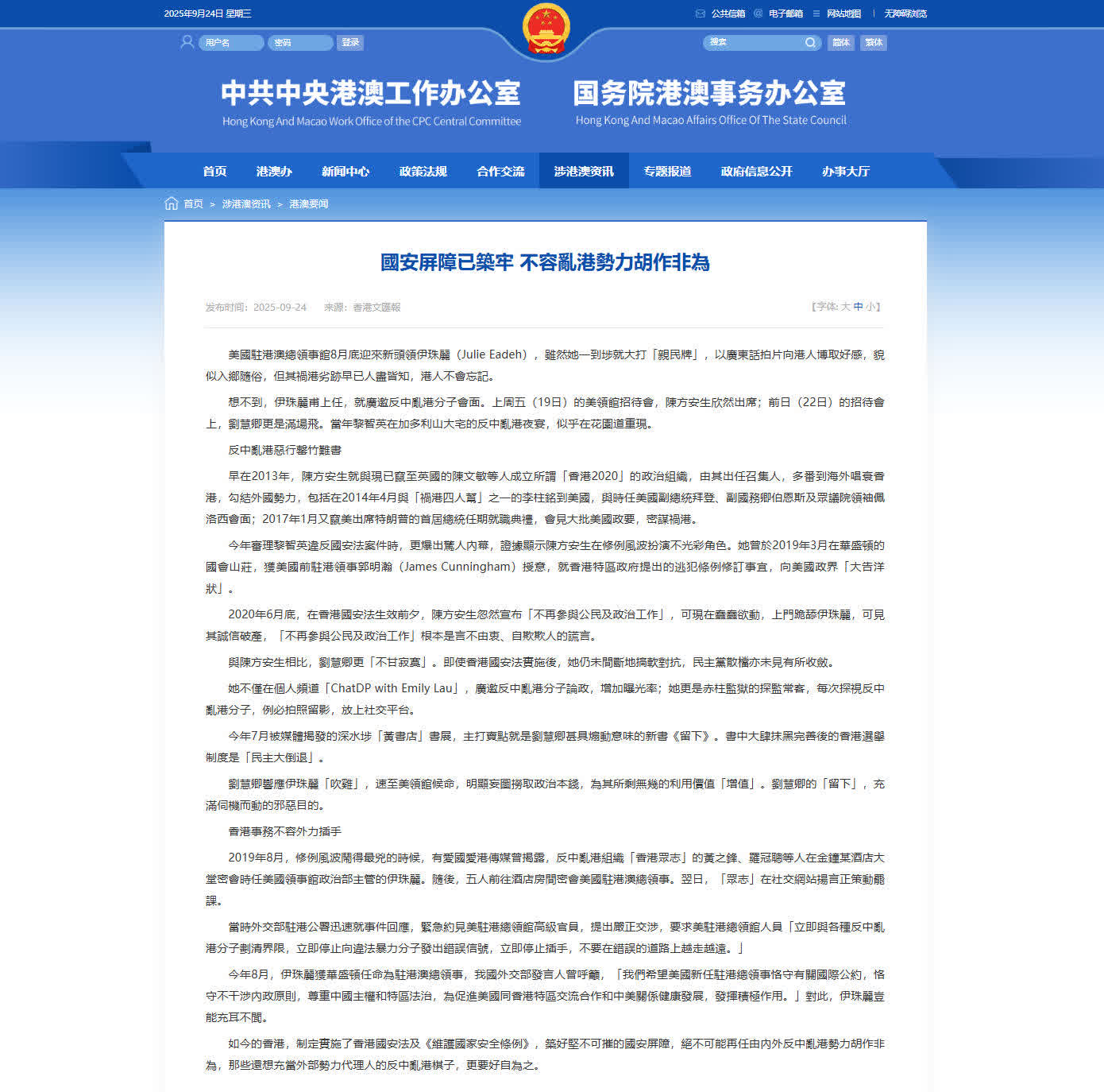 中央港澳工作辦公室、國務院港澳事務辦公室,9月24日在網站轉載香港《文匯報》題為《國安屏障已築牢 不容亂港勢力胡作非為》的時評文章,批美國駐港澳總領事館新頭領伊珠麗(Julie Eadeh)甫上任,就廣邀反中亂港分子會面,美領館招待會上陳方安生、劉慧卿露面,堪比「當年黎智英在加多利山大宅的反中亂港夜宴,似乎在花園道重現。」時評強調,如今的香港,制定實施了香港國安法及《維護國家安全條例》,築好堅不可摧的國安屏障,絕不可能再任由內外反中亂港勢力胡作非為,提醒「那些還想充當外部勢力代理人的反中亂港棋子,更要好自為之。」