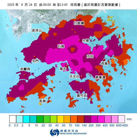 「樺加沙」吹襲香港期間,本港多處地區受暴風至颶風影響,整體的風力與2017年的「天鴿」、2023年的「蘇拉」及今年的「韋帕」相若,但較2018年的「山竹」弱。此外,受「樺加沙」雨帶影響,本港今日有頻密狂風大驟雨,由午夜至下午1時,普遍錄得超過100毫米雨量,部分地區更錄得超過200毫米。