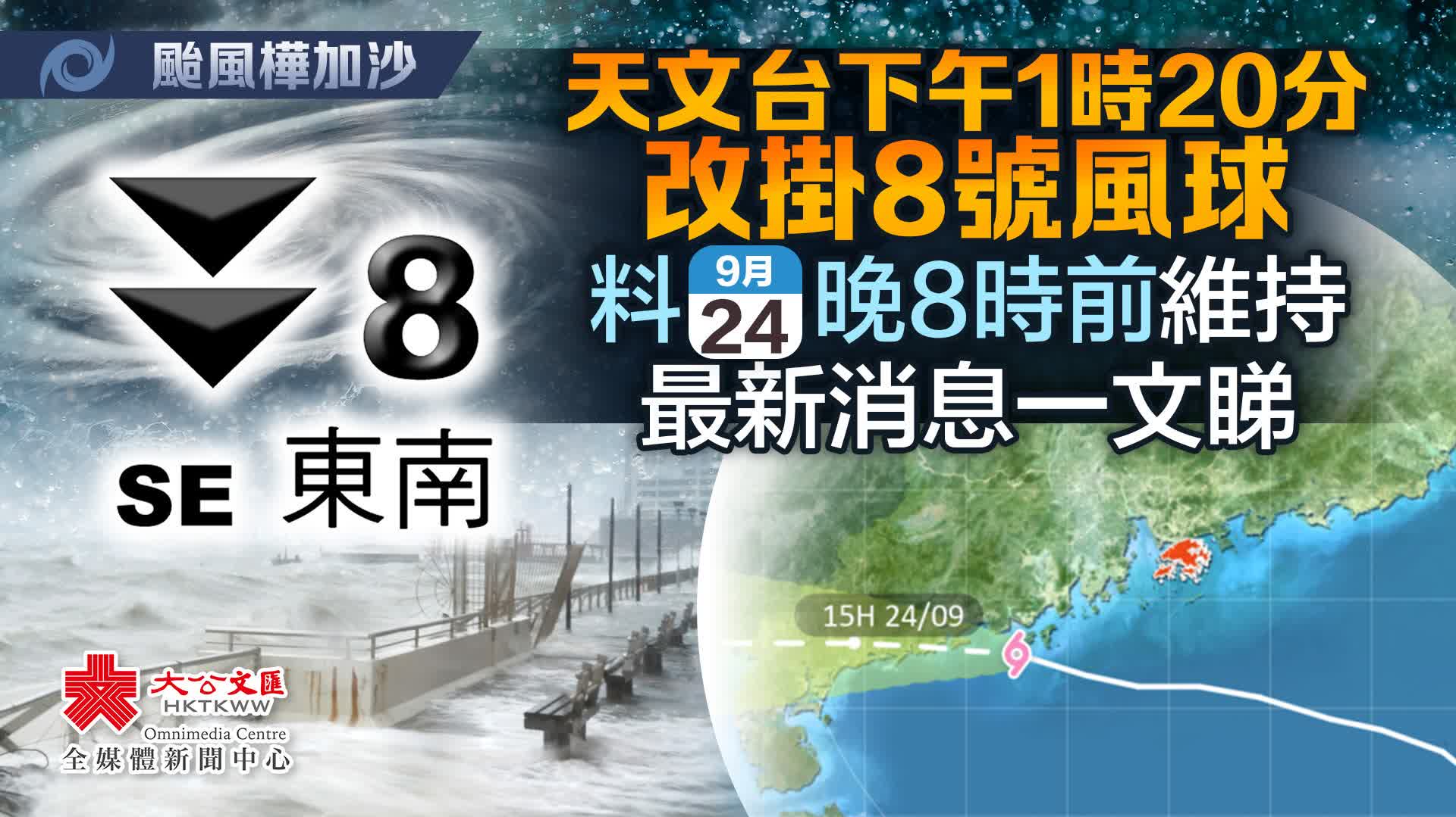 大公文匯全媒體報道,天文台今日(24日)16時45分表示,樺加沙正逐漸遠離香港,而本港風力亦逐步減弱,但烈風程度的東南風仍影響本港部分地區,離岸及高地間中達暴風程度。預料八號烈風或暴風信號會維持至今晚8時。隨後天文台會視乎本地風力減弱程度,考慮改發三號強風信號。