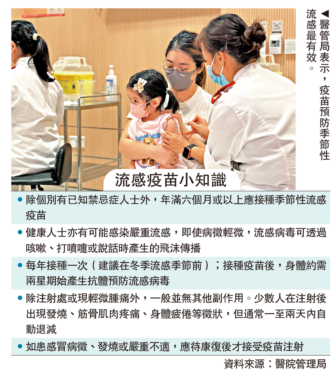 施詠雯表示,流感病毒不斷變化,世界衞生組織會更新疫苗成分,流感疫苗可有效減少重症、住院及死亡個案,除有禁忌症人士外,建議所有年滿6個月或以上人士每年接種。接種後身體需約兩周形成抵抗力,建議市民盡早接種。數據顯示,本港去年流感疫苗接種率升逾一成,共逾208萬人接種,令流感嚴重個案及死亡率低於新冠疫情前水平。她說,今年政府推出5項優化措施,對接種率持樂觀態度,又指疫苗數量能滿足市民的接種需求。