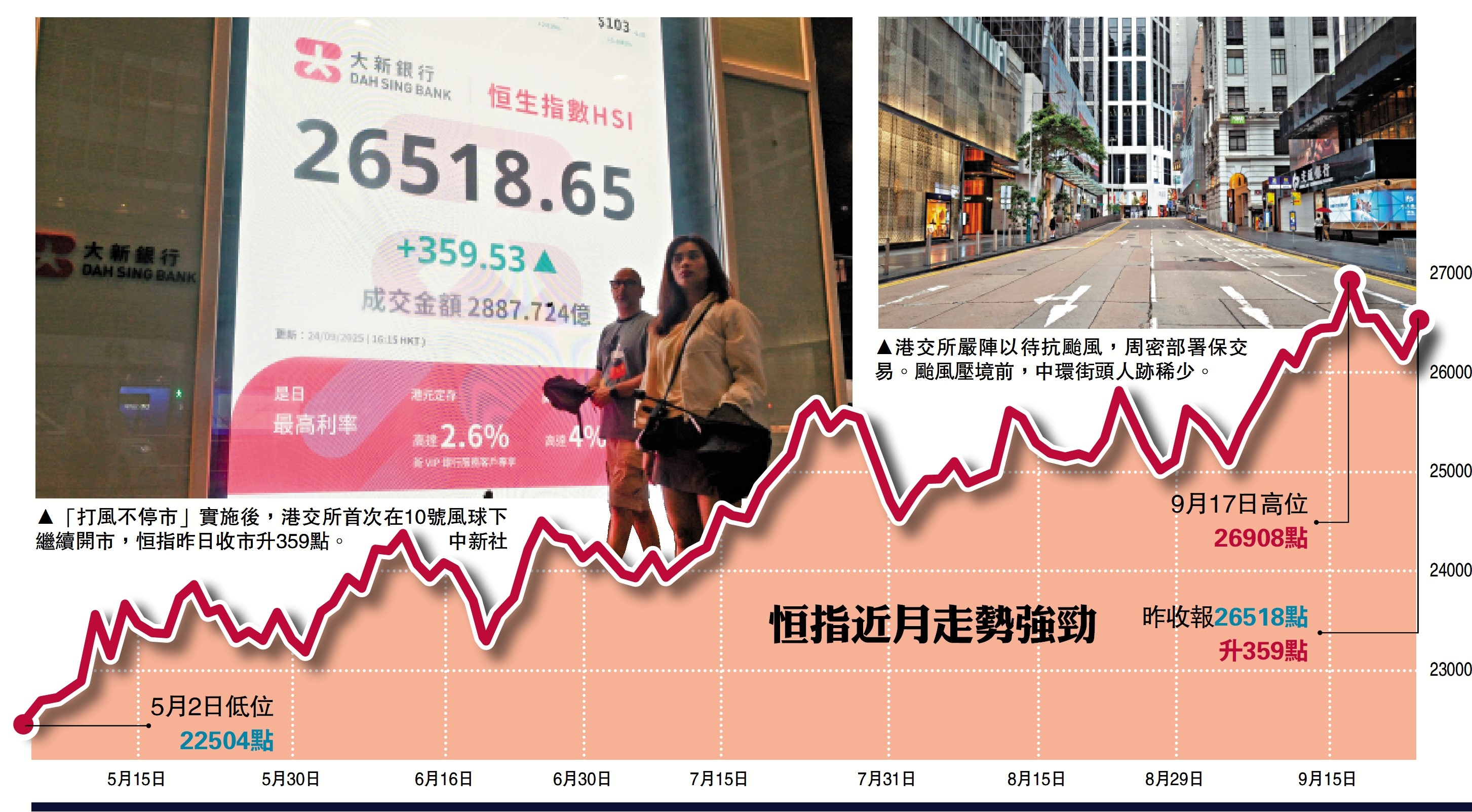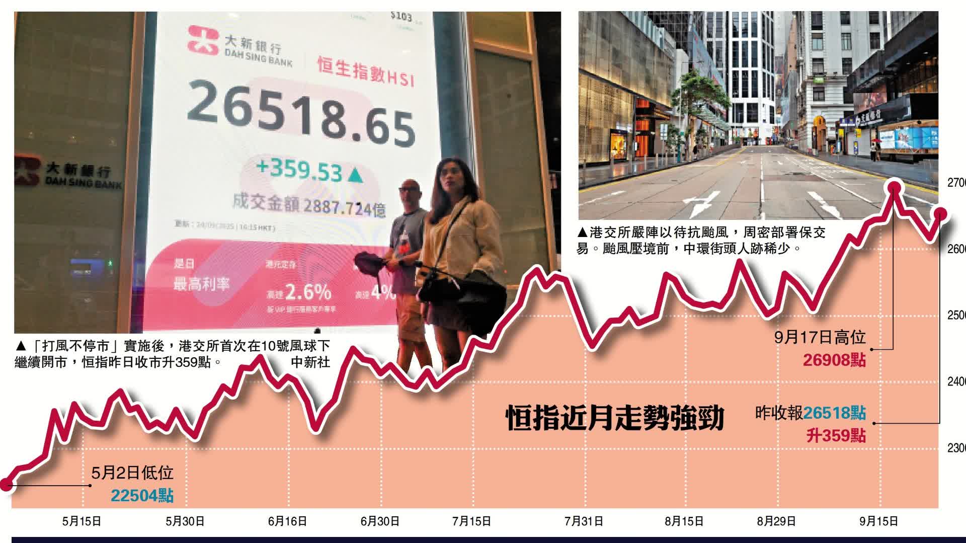 因應颱風樺加沙威脅,香港天文台昨日在日間時段維持十號及八號颶風信號。儘管如此,香港證券市場昨日正常運作,大市交投活躍,主板成交額達到2887億元,較上日減少57億元。南下資金經由港股通機制買入835.31億元,較上日增加108.08億元,全日淨買入137.04億元,扭轉上日淨流出40.68億元。