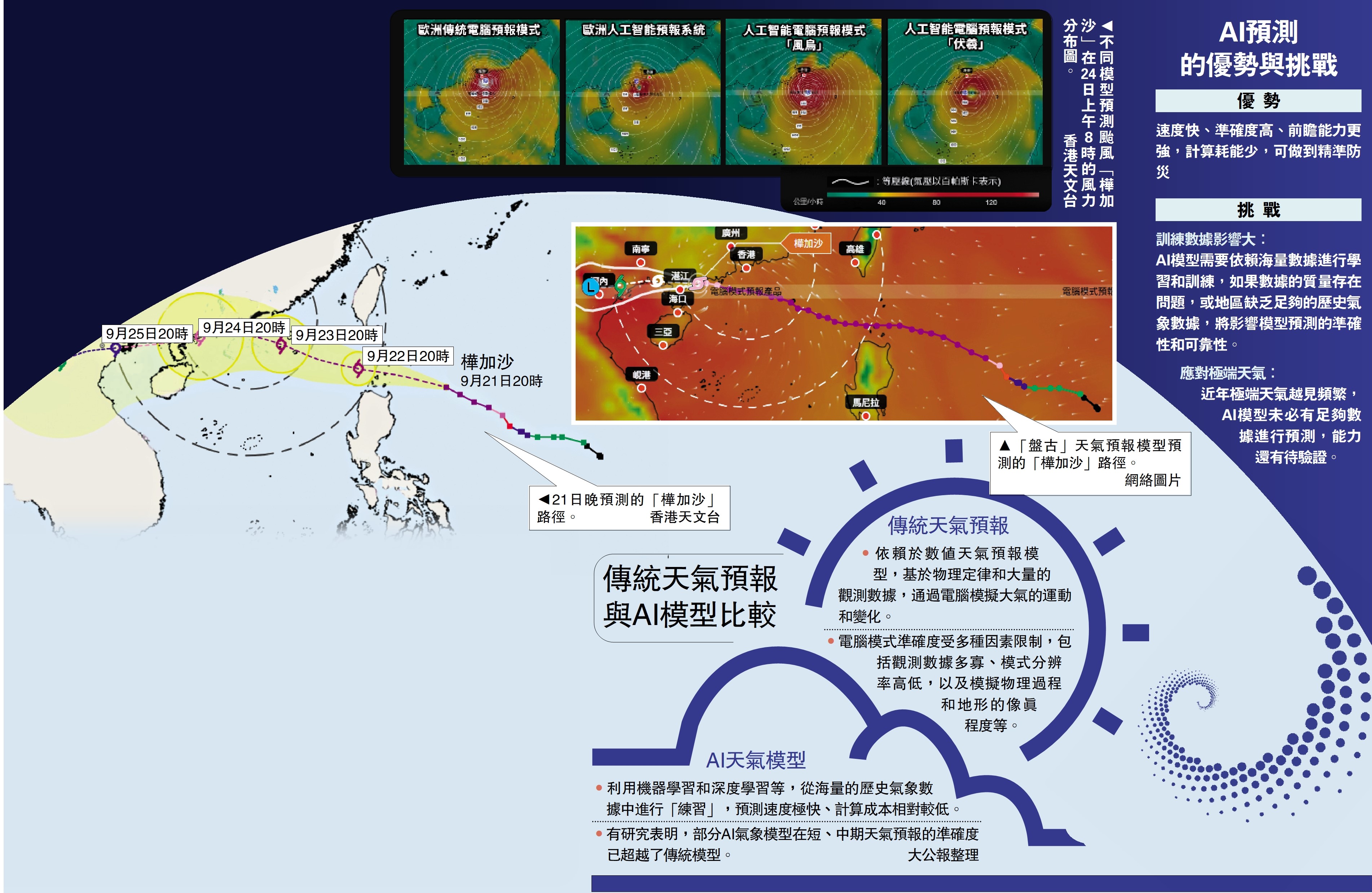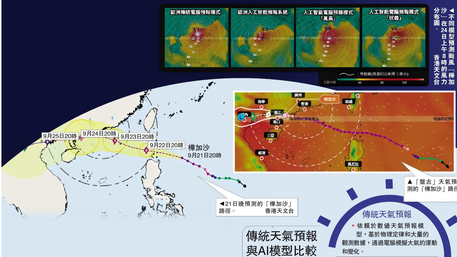 目前,香港天文台天氣預測時採用的是「博採眾長」模式,除了參考傳統的歐洲中期天氣預報中心電腦模式及其集成預報系統(即「歐中電腦模式」),還有四種人工智能模式,分別是中國的「風烏」「伏羲」和「盤古」,以及歐洲中期天氣預報中心人工智能預報系統(「歐中AIFS模式」)。
