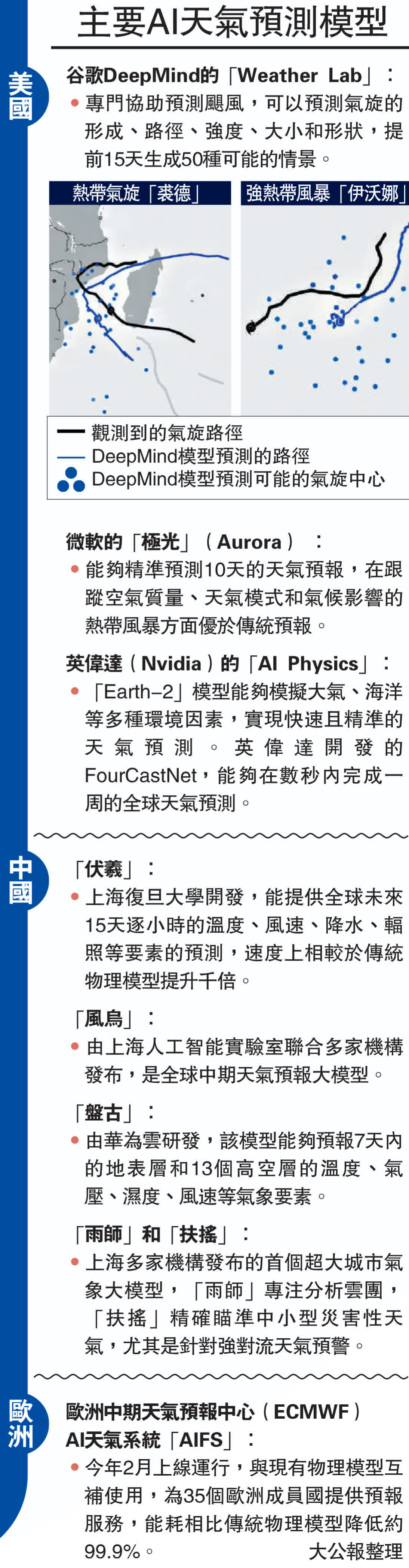 大公報報道,在全球變暖、自然極端天氣頻發的當下,快速、準確的天氣預測變得十分重要。傳統的數值天氣預報系統(NWP)運算成本高、預測速度慢等問題逐漸顯現,而人工智能(AI)正以驚人的速度和效率融入氣象領域並展示巨大的潛力。例如,谷歌(Google)旗下DeepMind開發的AI模型,預測風暴路徑相當精準,中國天氣預測AI模型「身經百戰」,表現亮眼。不過,AI對數據質量依賴極高,在應對前所未有的極端天氣時,其實際應用可靠性仍待驗證。