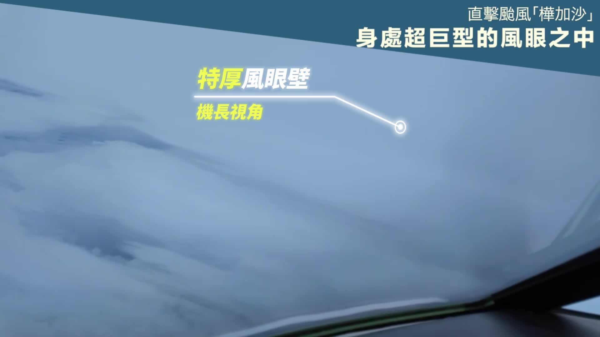 政府飛行服務隊派出定翼機直擊颱風「樺加沙」中心,收集天氣數據,定翼機更穿越風眼核心,穿過風眼瞬間拍攝到樺加沙嘅內部結構,畫面相當震撼。