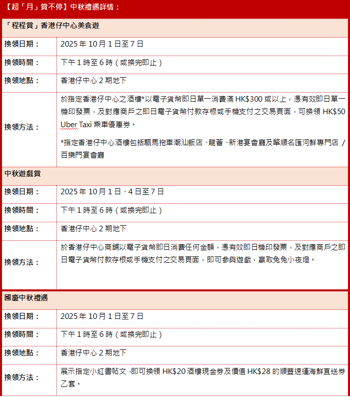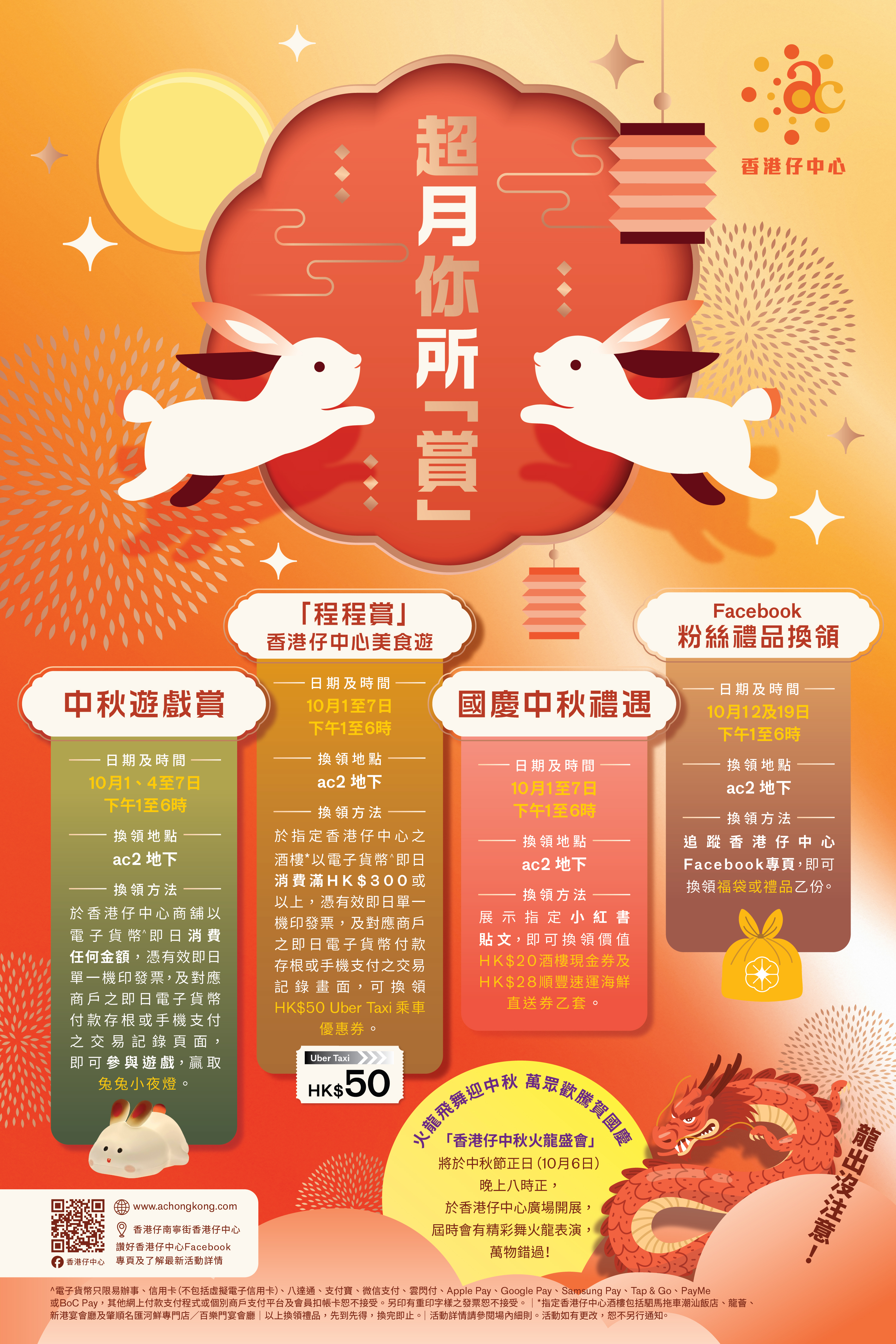 此外,香港仔中心將推出「超『月』你所『賞』」一系列中秋活動,包括互動遊戲、交通優惠及社交平台互動賞等多重禮遇將於10月1日起登場,加上「香港仔漁港嘗鮮—順豐直送」優惠,鼓勵市民開心暢遊香港仔。