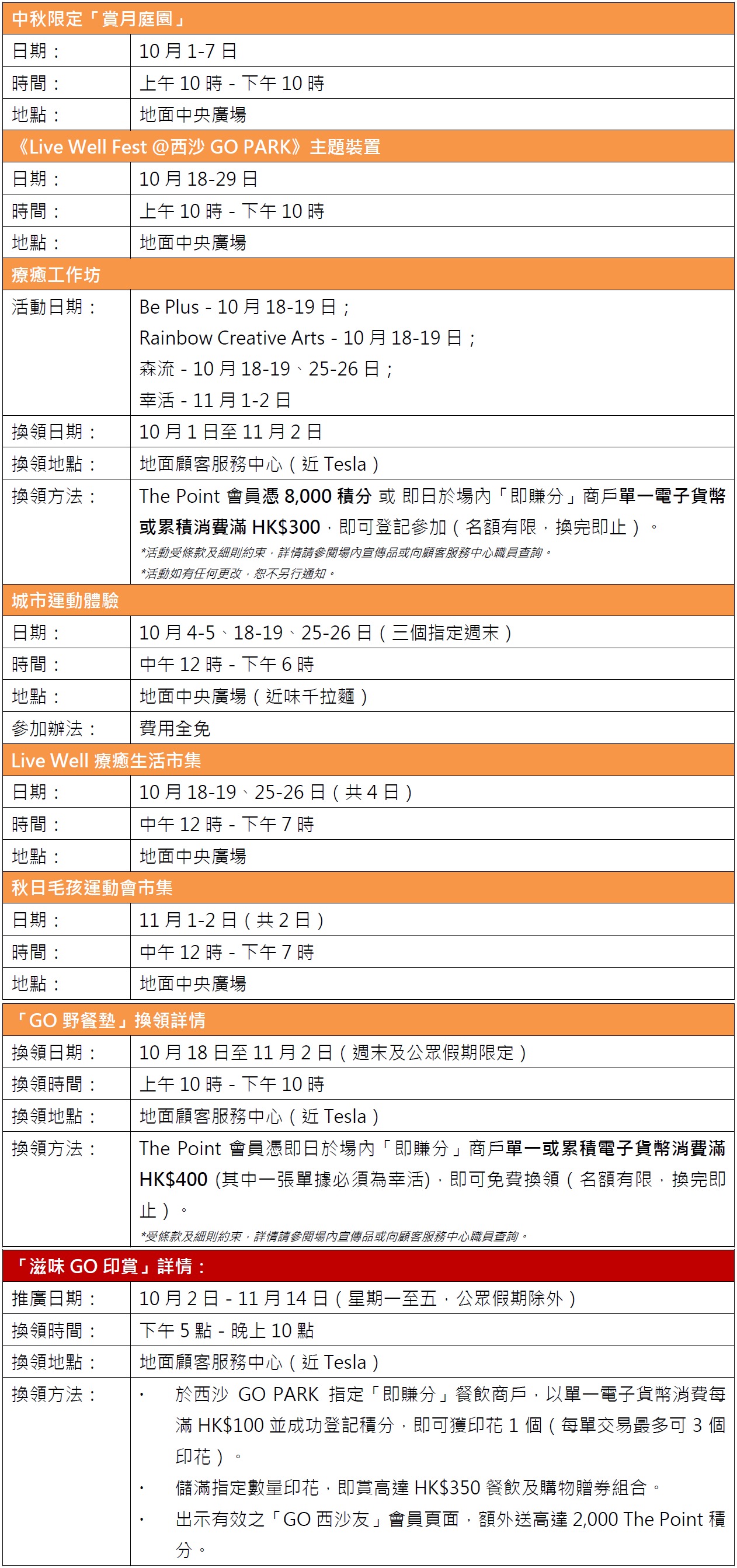 西沙GO PARK集運動、娛樂、休閒活動及餐飲於一身,10月期間三大主題活動輪流登場!中秋佳節,商場由10月1日至7日舉辦「賞月庭園」中秋活動,中央廣場布置七彩燈籠陣,在發光玉兔和月亮裝飾相伴下猜燈謎;緊接10月10日至12日有人氣男團MIRROR成員江𤒹生(Anson Kong)生日應援活動《百心同行:江𤒹生生日慈善嘉年華》,為偶像送上祝福;壓軸登場的是10月18日至11月2日《Live Well Fest西沙GO PARK》,展開Chill、食、買、玩的全方位身心療癒之旅,包括休憩拍照裝置、「Live Well療癒生活市集」及「秋日毛孩運動會市集」、強「心」健體的療癒工作坊,帶大家感受慢節奏生活!另外,The Point會員於場內指定餐飲商戶消費並儲滿指定印花,最高可賺價值HK$350餐飲及購物贈券,GO西沙友再賺2000The Point積分,嘆美食後享盡優惠獎賞,是犒賞自己的最佳「療程」!時間表如下: