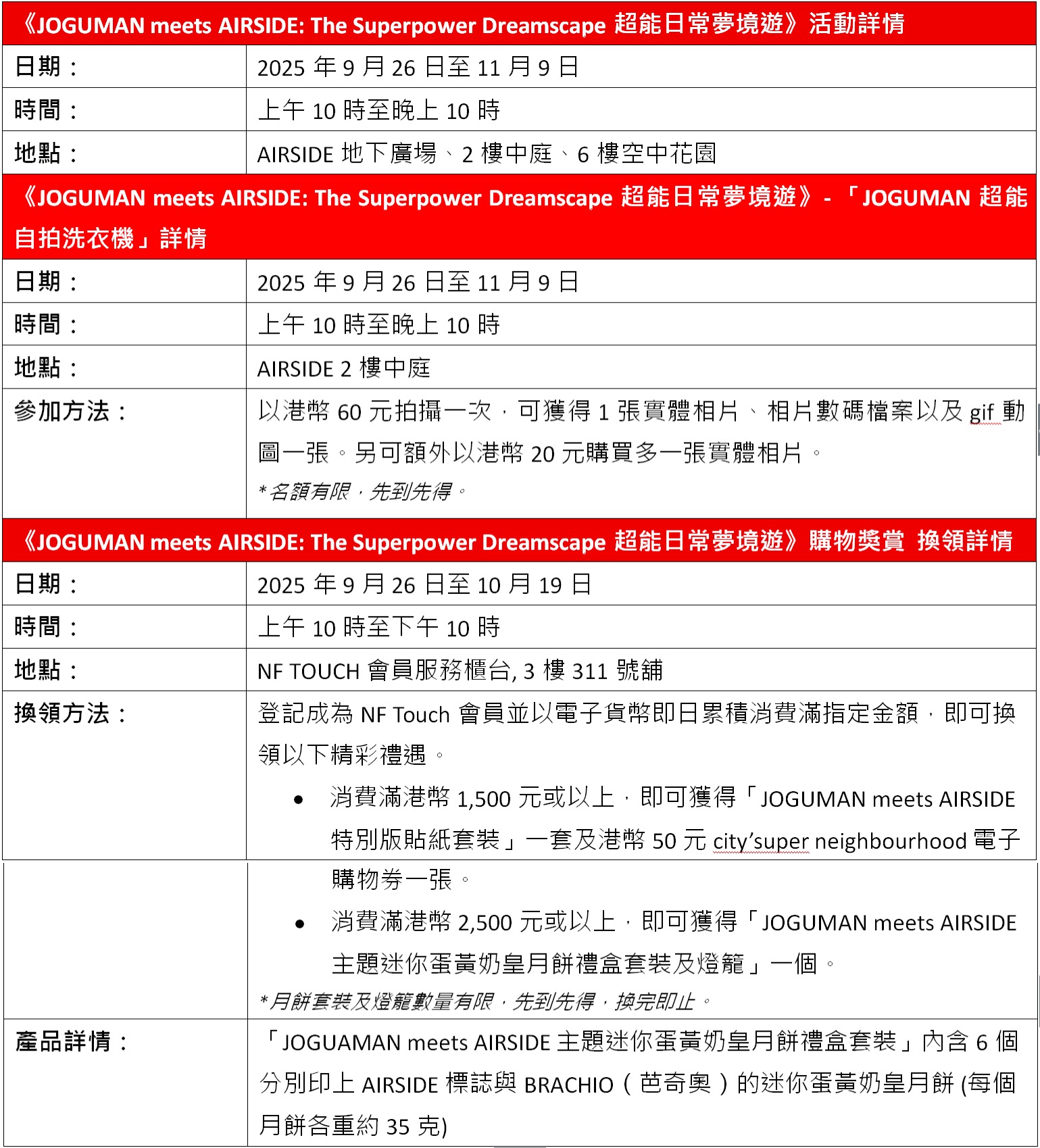 今個中秋,超人氣的的療癒系恐龍IP「JOGUMAN」登陸啟德AIRSIDE,帶領大家漫遊6大JOGUMAN夢境打卡位。位於AIRSIDE露天廣場的5米高月亮裝置前,首次穿上紅色鬥篷變身超能JOGUMAN拍檔的BRACHIO(芭奇奧)與WOODY(胡迪),擺定霸氣英姿陪大家打卡賞月共度佳節;全港首個6米高「巨型BRACHIO(芭奇奧)」超能恐龍霸氣坐鎮AIRSIDE的2樓中庭、旁邊更特設「JOGUMAN超能自拍洗衣機」、「白日夢想家專用車廂」與「JOGUMAN 超能充電站」;6樓空中花園及商場各處亦有不少JOGUMAN蹤影等你來發掘!誠邀所有喜愛JOGUMAN的朋友齊齊踏上「JOGUMAN meets AIRSIDE: THE SUPERPOWER DREAMSCAPE超能日常夢境遊」之旅,一齊創造溫馨中秋回憶!今個中秋更首次推出JOGUMAN主題迷你蛋黃奶皇月餅禮盒及燈籠,陪伴你細味團圓時光!