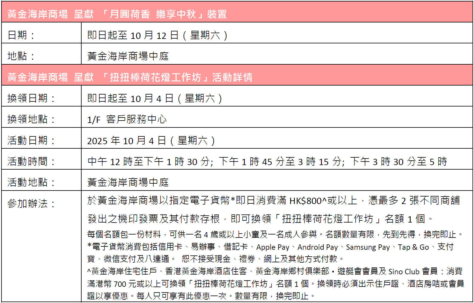 黃金海岸商場於10月4日舉辦「扭扭棒荷花燈工作坊」,大家可在專業導師指導下,以好玩有趣的扭扭棒製作荷花燈。